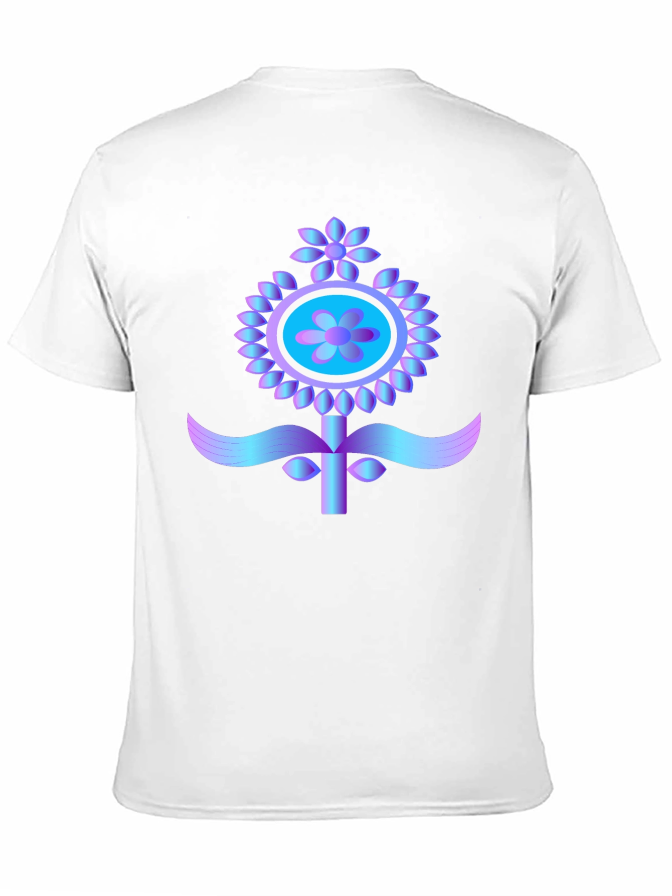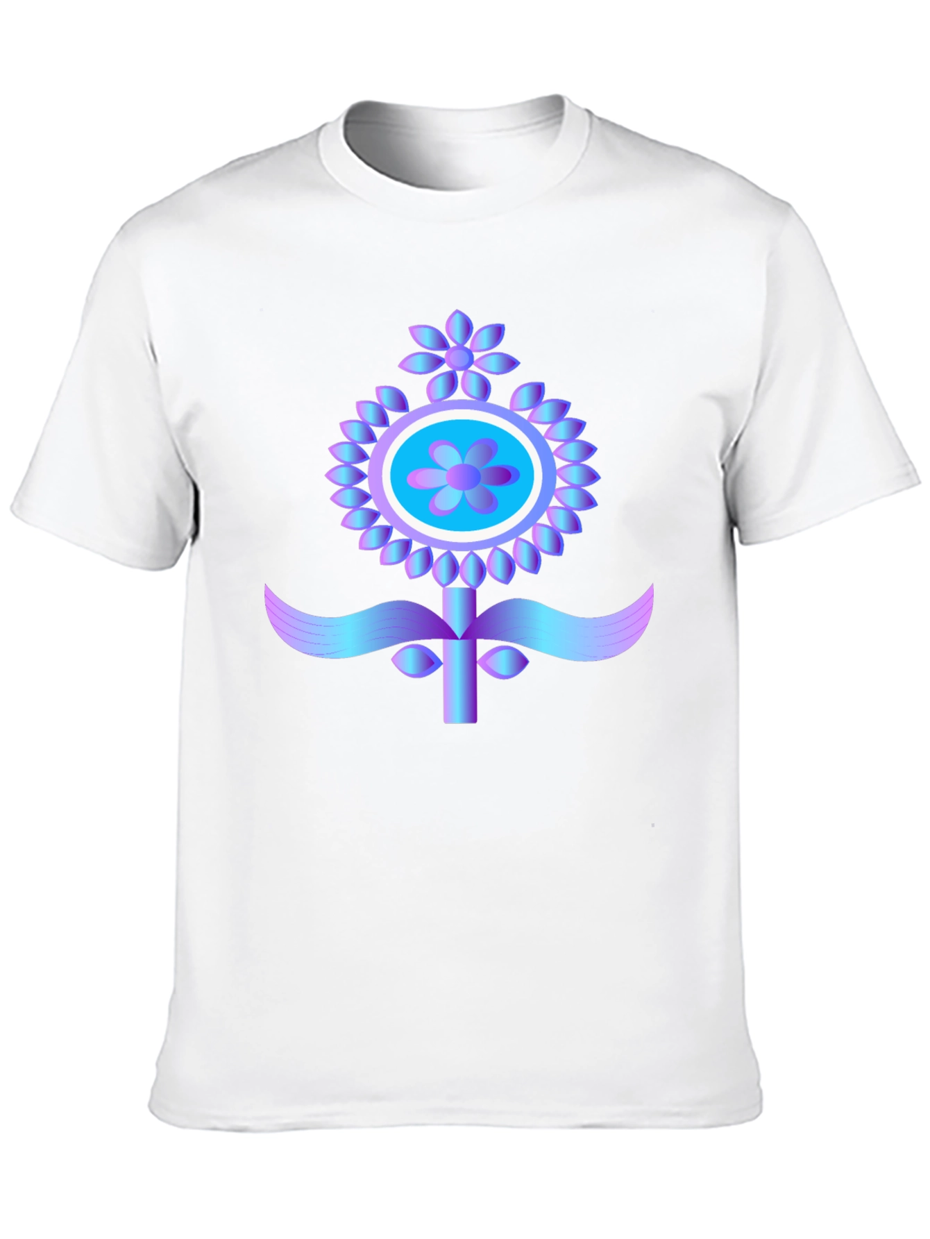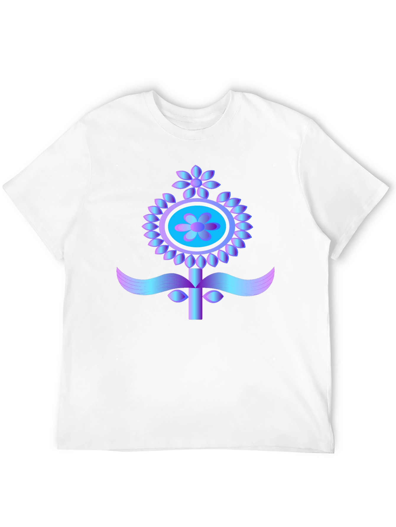 Show off your unique style with this black t-shirt featuring a mesmerizing abstract floral graphic. The design showcases a stylized flower with gradient shades of blue and purple, creating a modern and eye-catching look. Made from comfortable fabric, this t-shirt is perfect for casual outings, social gatherings, or simply relaxing at home. The striking graphic print makes it a versatile piece that can be paired with jeans, shorts, or even a skirt for a touch of artistic flair. Stand out from the crowd and express your individuality with this statement t-shirt!