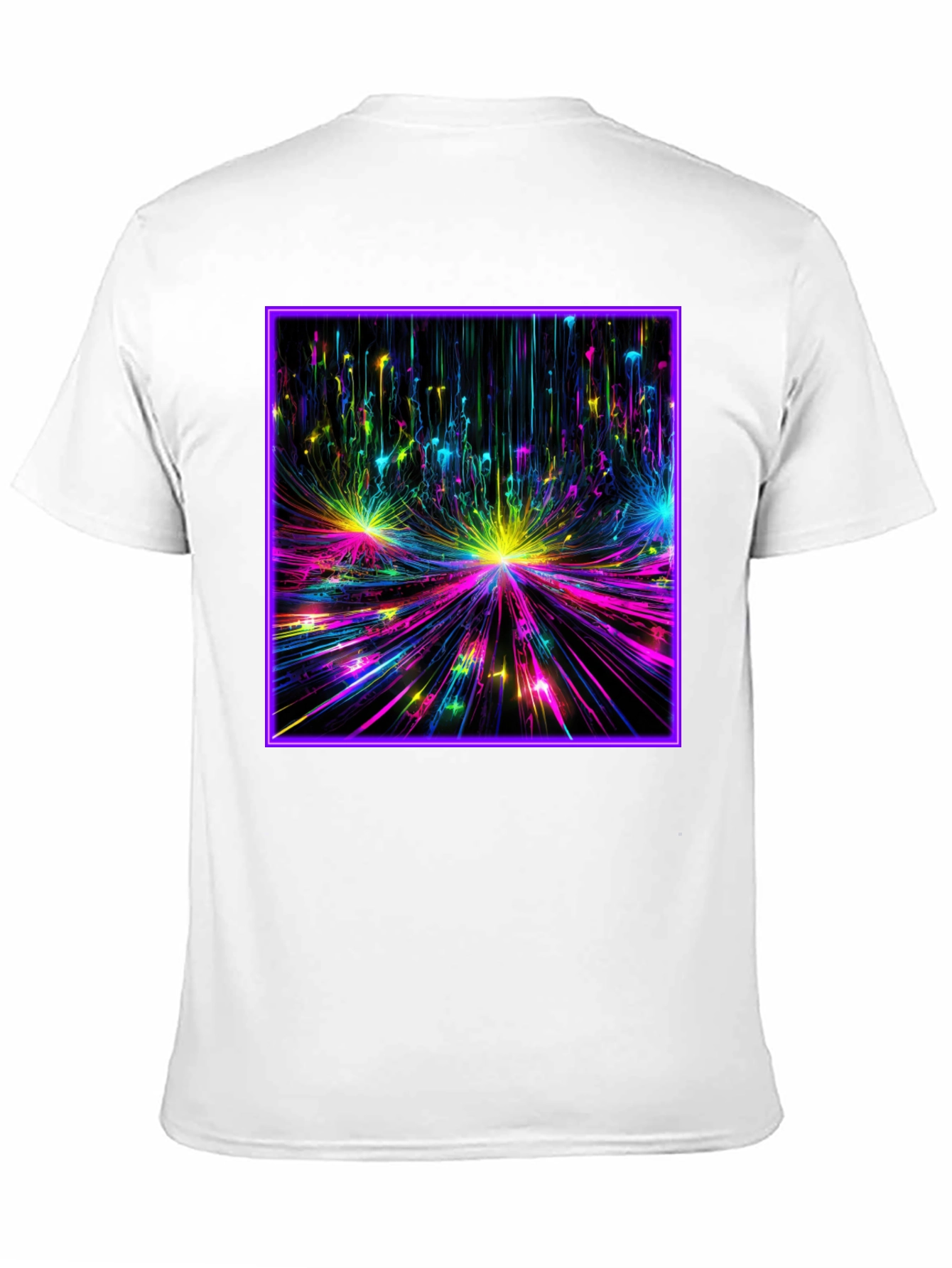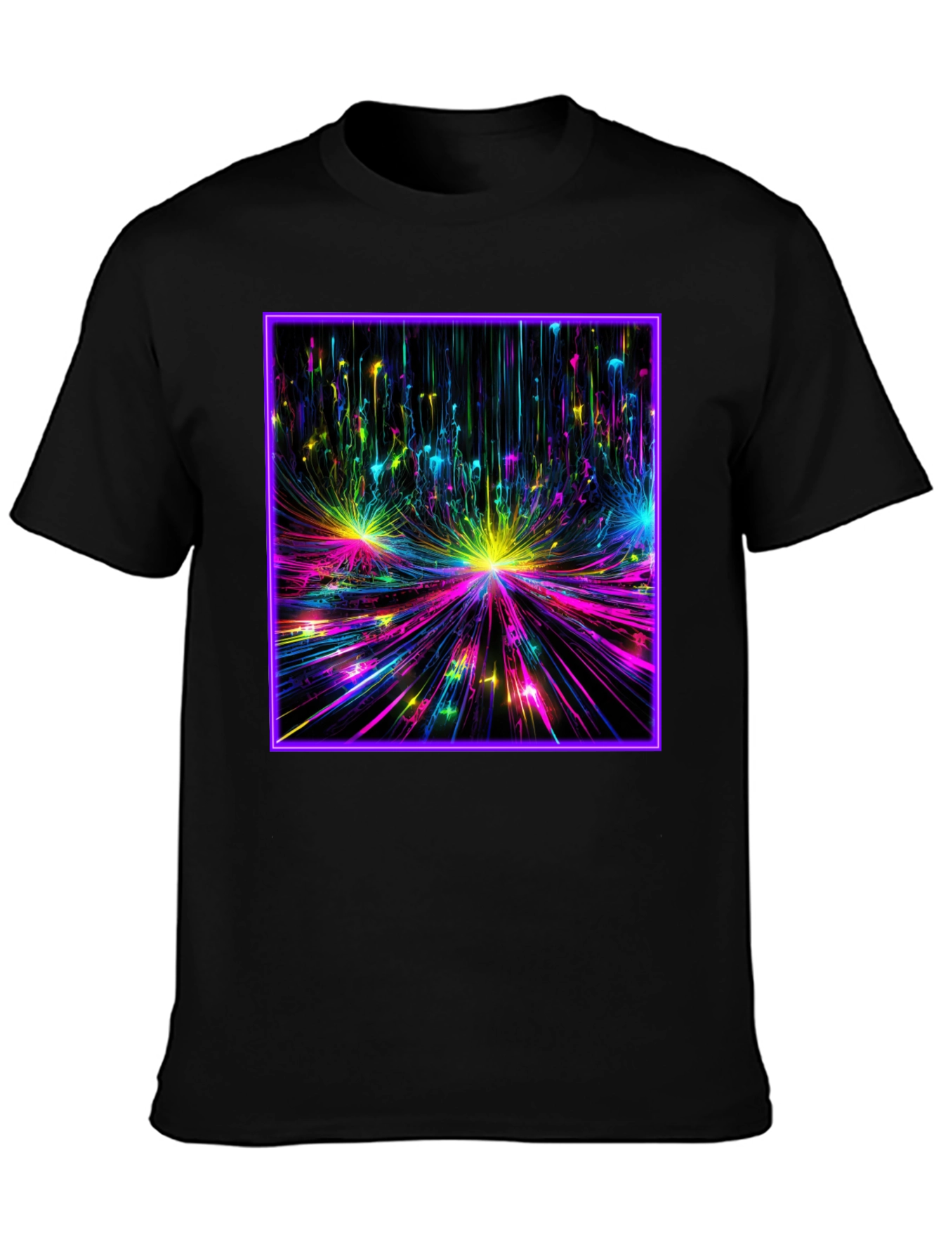 Make a statement with this eye-catching black graphic tee. The shirt features a vibrant, abstract design of neon bursts, encased in a neon purple border. The colorful artwork pops against the black backdrop, creating a visually stunning effect. Perfect for those who love bold, unique designs. It can be a conversation starter, this T-shirt is ideal for casual outings, concerts, or everyday wear. Crafted from a comfortable cotton blend, this tee offers a relaxed fit and is easy to care for. Add a touch of artistry to your wardrobe with this one-of-a-kind graphic tee.