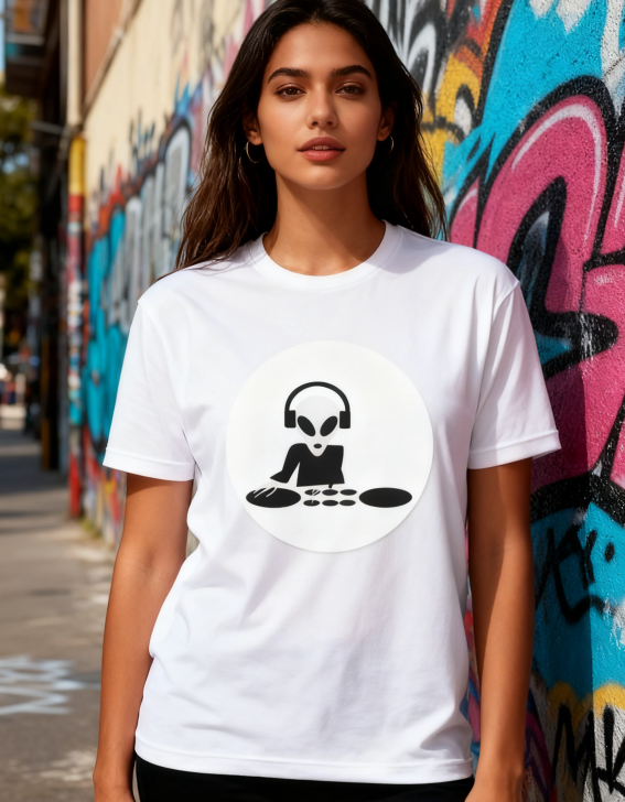 A white crew neck t-shirt featuring a black and white graphic of an alien DJ wearing headphones and operating turntables, set against a circular white background with a light gray square border. The minimalist design combines sci-fi elements with music culture, creating a unique and eye-catching look. Made from soft, breathable cotton, this tee offers a comfortable fit for everyday wear. Perfect for music festivals, casual outings, or anyone who loves alien and DJ-themed fashion.
