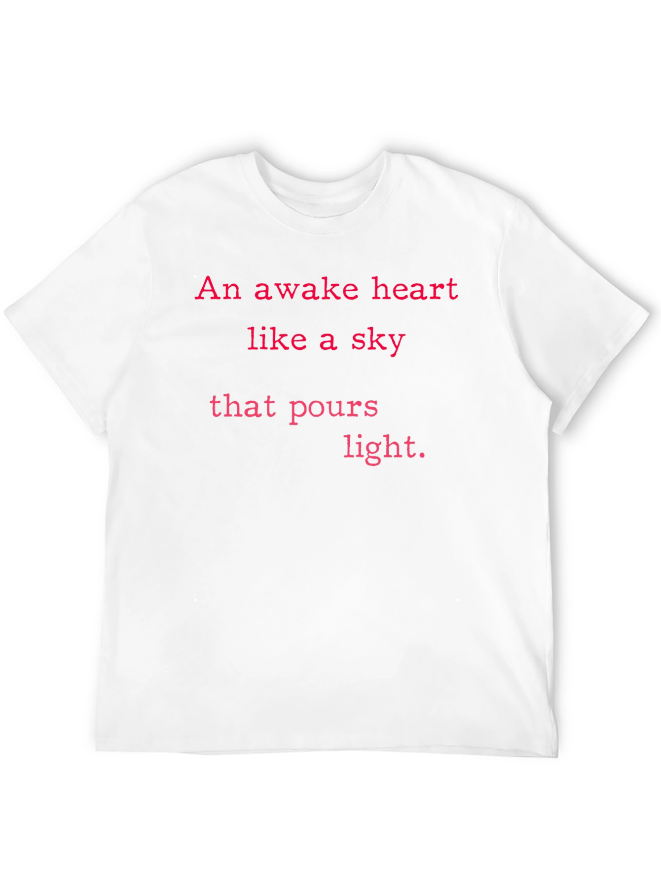 This black t-shirt features a poetic message in a pink font that reads: "An awake heart like a sky that pours light." The simple yet profound quote adds a touch of thoughtfulness to everyday wear. Made from a comfortable-looking fabric, this tee is perfect for expressing your inner thoughts and style. Dress it up or down for casual outings, introspective moments, or just adding a unique piece to your wardrobe. Embrace the light with this inspiring graphic tee.