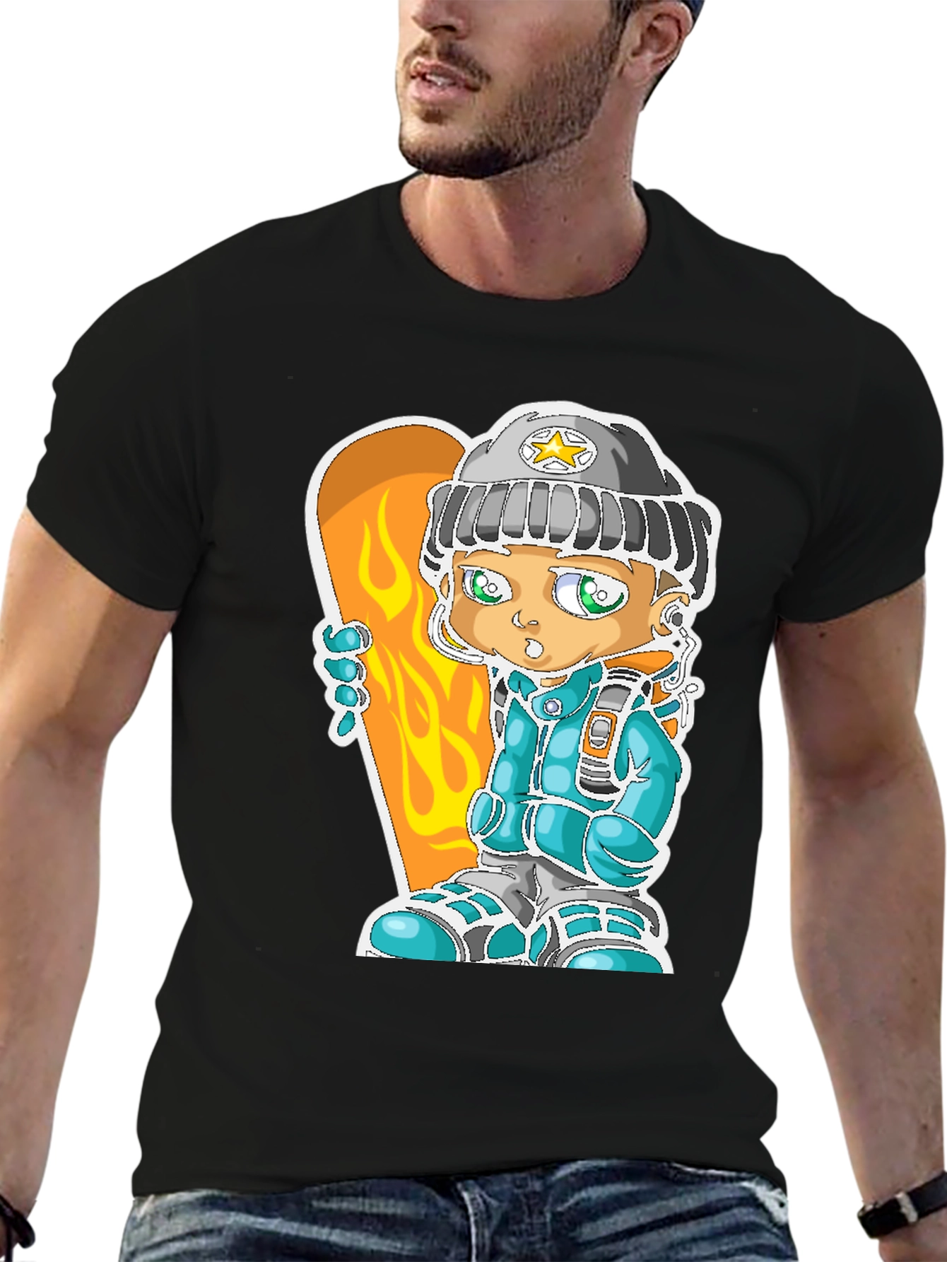 This eye-catching black t-shirt features a unique cartoon graphic of a snowboarder. The design showcases a character in snowboarding gear, complete with a beanie, jacket, and a snowboard with flame details. The vibrant colors and detailed artwork make this tee a standout piece. Made from a comfortable material, it's perfect for casual wear, sporting events, or showcasing your love for snowboarding. This shirt is sure to be a conversation starter and a great addition to any wardrobe.