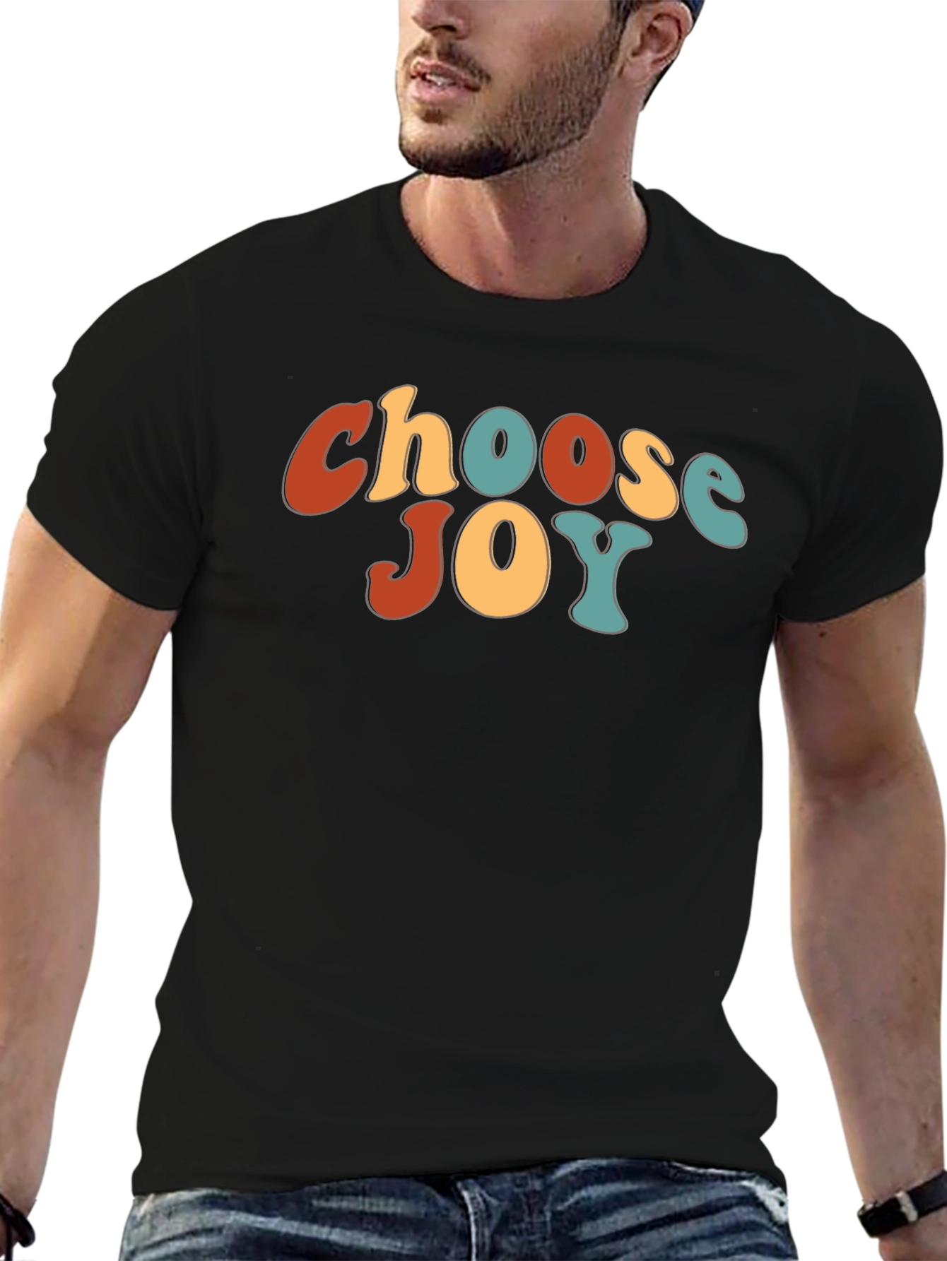 Embrace positivity with this stylish unisex black t-shirt featuring a vibrant retro-inspired "Choose Joy" graphic. The design boasts a playful, colorful font with a vintage feel, perfect for adding a touch of cheer to your everyday wardrobe. Crafted from a comfortable fabric, this tee is ideal for casual wear, lounging at home, or making a statement wherever you go. The classic fit ensures a relaxed and flattering silhouette for all body types. Spread good vibes and inspire others with this eye-catching and uplifting t-shirt. A must-have addition to any wardrobe!