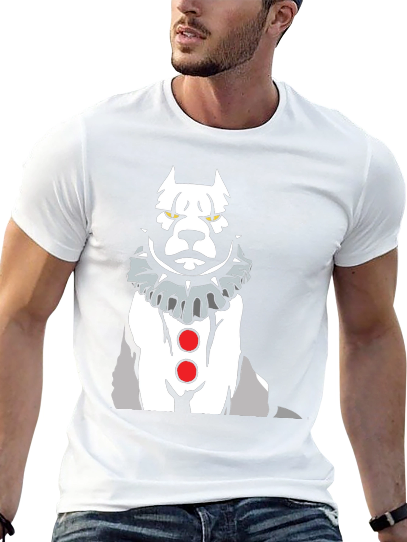 Unleash your inner humor with this unique men's black T-shirt. Featuring a bold and eye-catching graphic print of a pitbull styled as a clown, this tee is sure to turn heads. The detailed design showcases a white and gray dog wearing a clown ruffle collar and two red buttons. Made from a soft, comfortable fabric, it's perfect for everyday wear. Whether you're heading to a casual gathering or just want to express your playful personality, this shirt is an excellent choice. Add a touch of whimsy to your wardrobe with this statement tee!