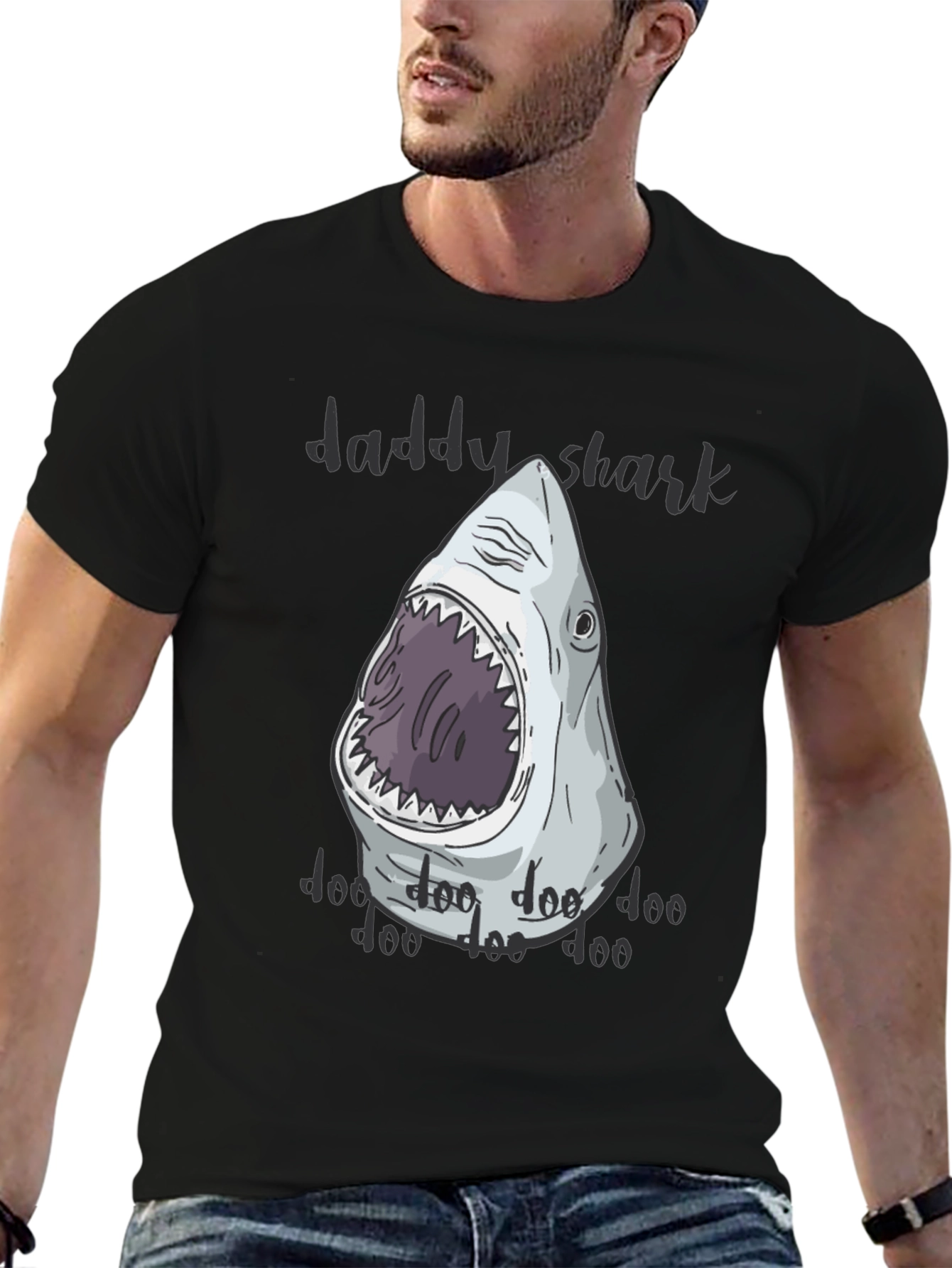 Dive into fun with this playful black t-shirt featuring a cartoon great white shark head with its mouth wide open. Above the shark is the phrase "daddy shark" and below the shark is the phrase "doo doo doo". Made from what appears to be a soft, breathable cotton blend, this comfortable tee is perfect for casual wear, family outings, or themed parties. Show off your love for this iconic tune in style. Pair it with jeans or shorts for a relaxed, eye-catching look.