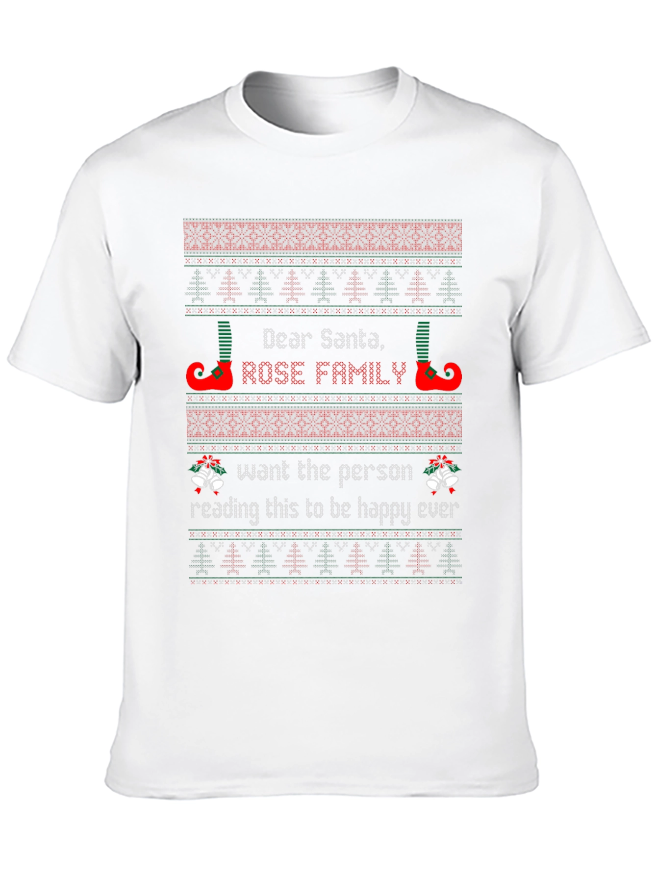 Get ready for the holidays with this festive black t-shirt featuring a Christmas sweater design! The shirt reads "Dear Santa, Rose Family" with elf shoes, bells and a holiday-themed pattern above and below the text. The design is made to look like a knit christmas sweater. This t-shirt is perfect for family gatherings, Christmas parties, or just spreading holiday cheer. Made with comfortable materials, this shirt is a great gift or addition to your Christmas wardrobe.