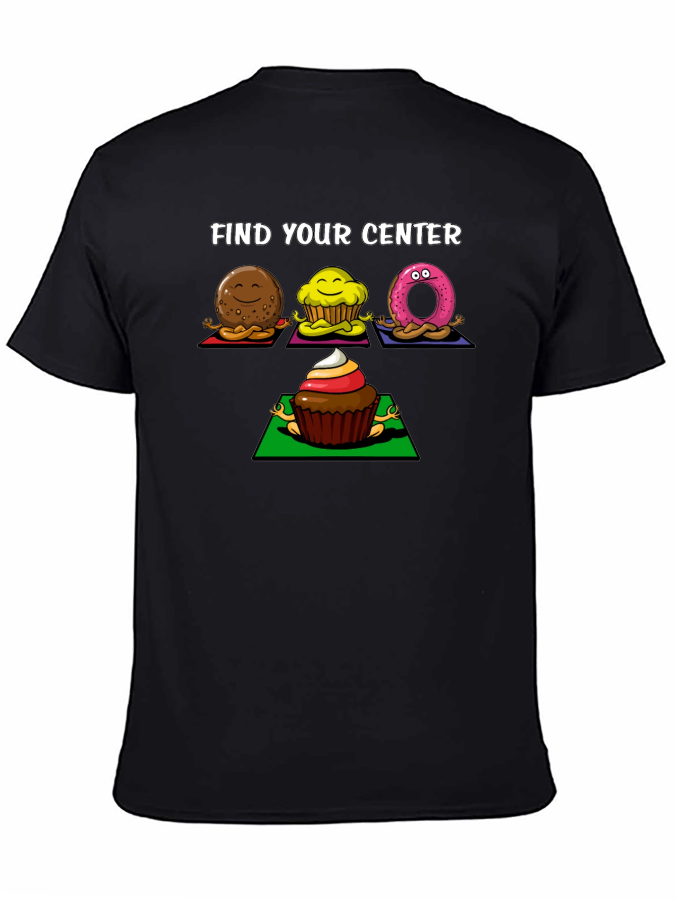 Find your inner peace with this whimsical black t-shirt! Featuring a playful design of sweets doing yoga on mats, including a cupcake, donut, muffin, and cookie, this tee is perfect for yoga enthusiasts and dessert lovers alike. The vibrant colors of the treats add a touch of fun to your everyday wardrobe. Made from a soft, comfortable fabric, this t-shirt is ideal for casual wear, yoga classes, or simply lounging at home. Express your love for sweets and mindfulness with this unique and eye-catching t-shirt. Namaste!
