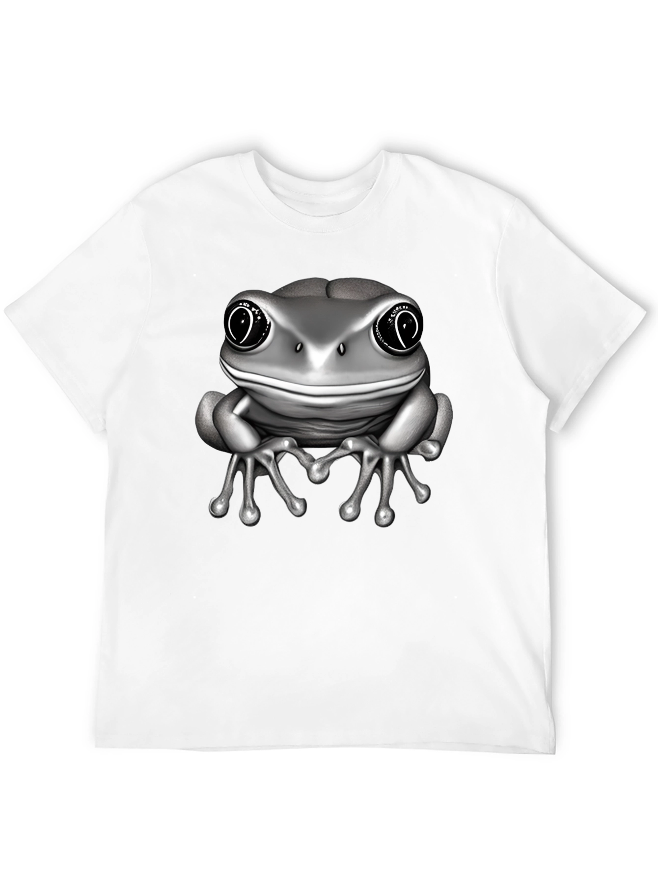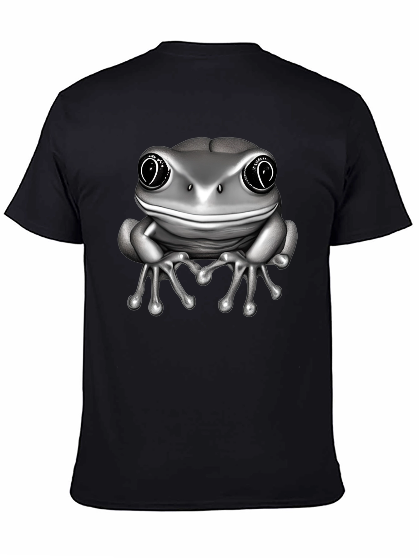 Embrace quirky style with this unique men's black t-shirt. The shirt features a bold graphic of a silver frog. The frog appears to have large eyes and a friendly expression. Crafted from a comfortable-looking fabric, this tee is perfect for casual wear. Its eye-catching design makes it a great conversation starter and a fun addition to any wardrobe. Wear it to express your personality, whether you're hanging out with friends or running errands. A statement piece that combines comfort and individuality, this t-shirt is a must-have for those who dare to stand out.