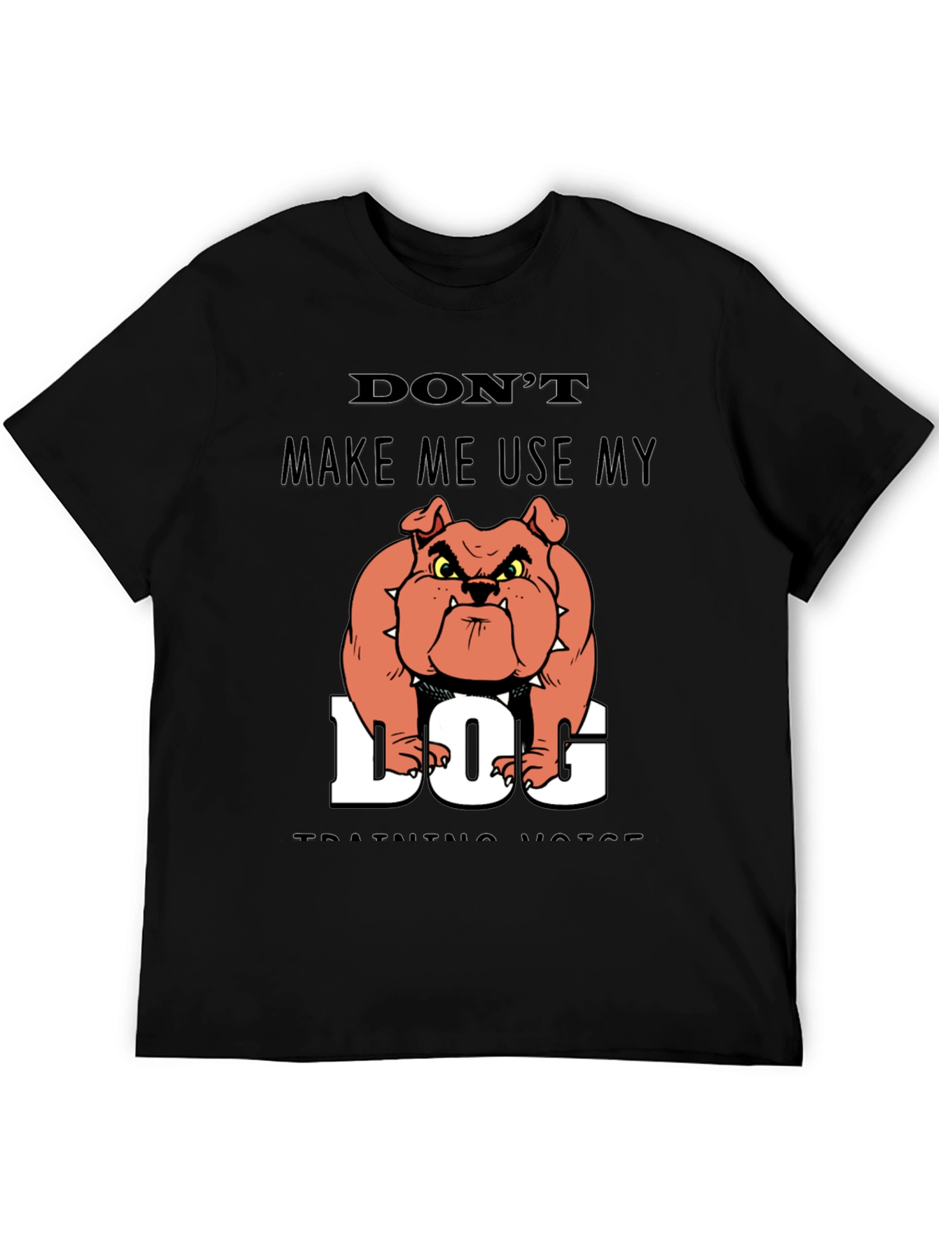 Show off your love for dogs with this hilarious black T-shirt. Featuring a cartoon bulldog with a spiked collar and an angry expression, the shirt humorously warns, "DON'T MAKE ME USE MY DOG TRAINING VOICE." Made from a soft-looking fabric, this tee is perfect for casual wear, dog training sessions, or as a humorous gift for dog lovers and trainers. The bold design and amusing message are sure to turn heads and spark conversations. Comfortable and stylish, it's a must-have for anyone with a passion for canines and a sense of humor.