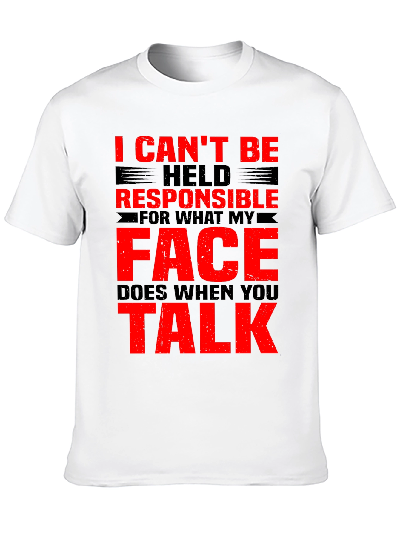 This black t-shirt features a bold, red graphic design with a humorous statement: "I CAN'T BE HELD RESPONSIBLE FOR WHAT MY FACE DOES WHEN YOU TALK." The short-sleeved tee appears to be made from a soft, comfortable cotton blend. Its classic fit makes it perfect for casual wear, lounging, or making a statement. This tee is sure to get a laugh and spark conversations. Ideal for those with a sarcastic sense of humor, it is a fun addition to any wardrobe. Wear it to parties, casual outings, or anywhere you want to express your personality and bring a smile to people's faces.