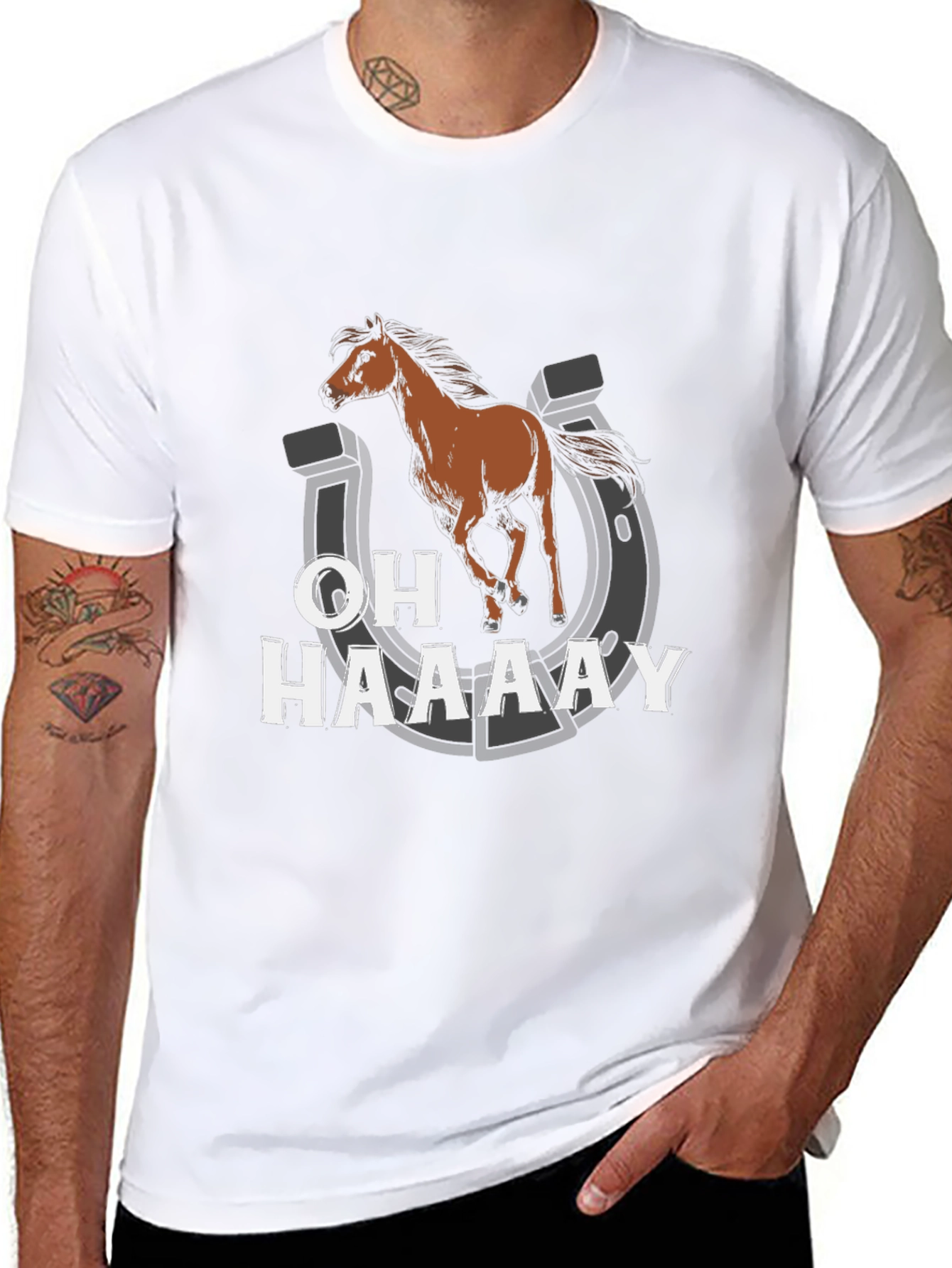 This black t-shirt features a hilarious graphic design that's sure to turn heads. The design includes a detailed image of a brown horse, complete with flowing mane and tail, superimposed over a horseshoe shape. Bold white text reads "OH HAAAAY" in a playful font across the center. This humorous tee is made from a comfortable, breathable fabric ideal for everyday wear. Perfect for horse lovers or anyone with a quirky sense of humor, this t-shirt is a fun addition to any wardrobe. Wear it casually with jeans or shorts for a comfortable and stylish look. Get yours now and let the fun begin!