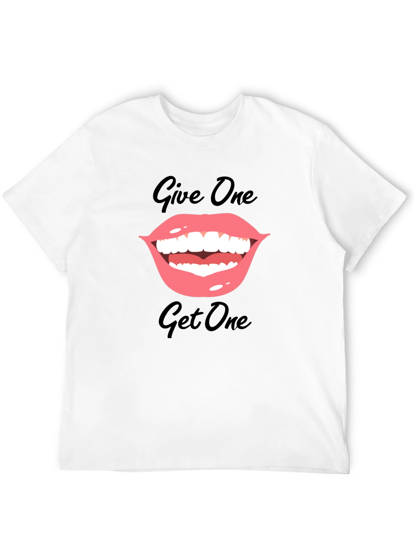 Show off your pearly whites with this bold graphic t-shirt. This black tee features a large, detailed image of lips and teeth in a pink hue, framed by the phrases "Give One" and "Get One" in a stylish font. The soft fabric ensures a comfortable fit, perfect for casual outings, making a statement, or as a fun gift for someone with a great sense of humor. Pair it with your favorite jeans or shorts for an effortless and eye-catching look.