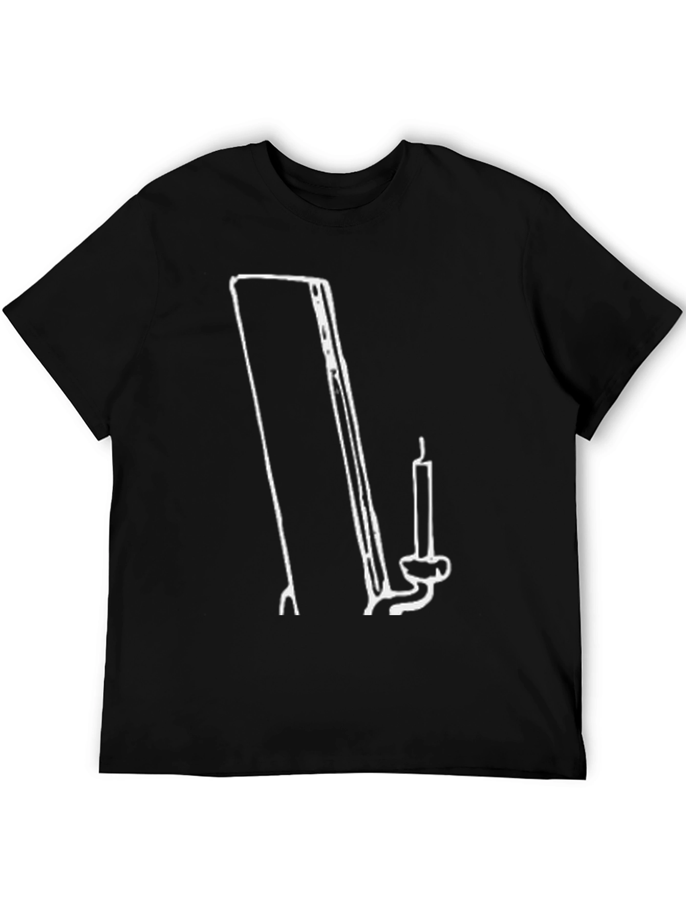 This stylish black t-shirt features a unique white graphic print of a mirror and candle. The design is modern and eye-catching, making it a perfect statement piece for your wardrobe. Made from a comfortable, soft fabric, this tee is ideal for everyday wear. Dress it up with jeans and a jacket for a night out, or keep it casual with shorts for a relaxed weekend look. The classic fit ensures a flattering silhouette for all body types. Show off your individual style with this trendy graphic t-shirt.
