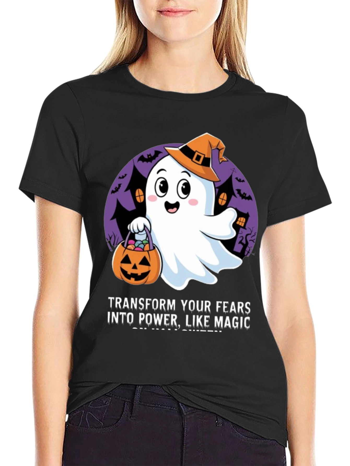 Get into the spooky spirit with this unique Halloween T-shirt. Featuring a cute ghost wearing an orange witch hat and carrying a jack-o'-lantern treat bucket, this tee is perfect for trick-or-treating or Halloween parties. The design includes a spooky backdrop with bats and haunted houses. "Transform Your Fears Into Power, Like Magic On Halloween" printed below adds a fun, inspirational touch. Made from comfortable materials, this t-shirt offers both style and comfort. Wear it to celebrate Halloween, and show off your love for all things spooky and fun. Perfect for Halloween parties or casual wear.