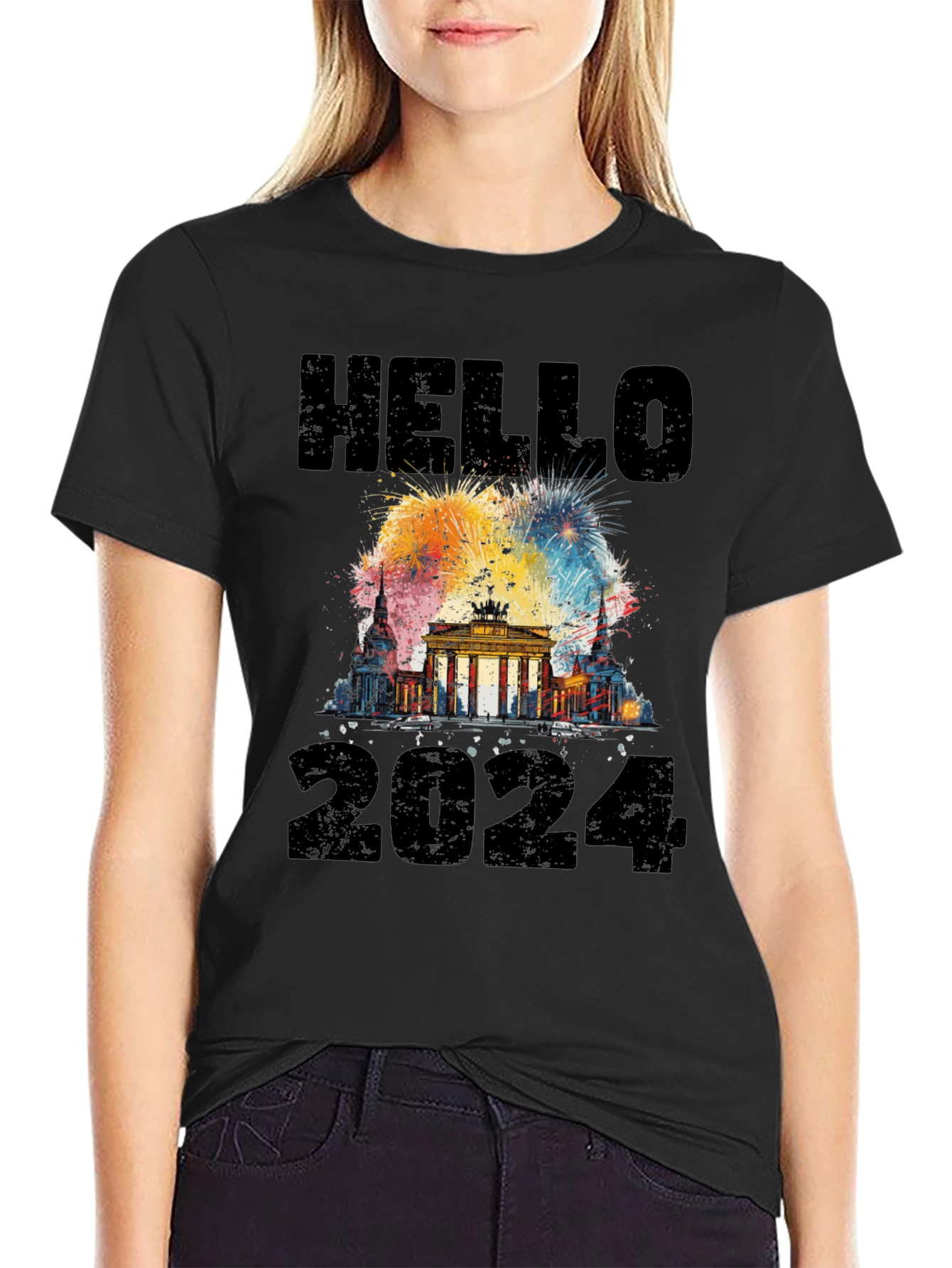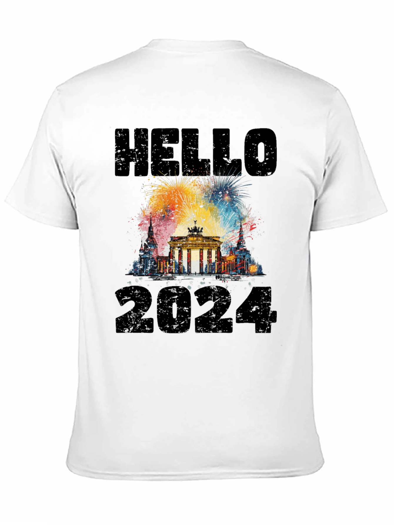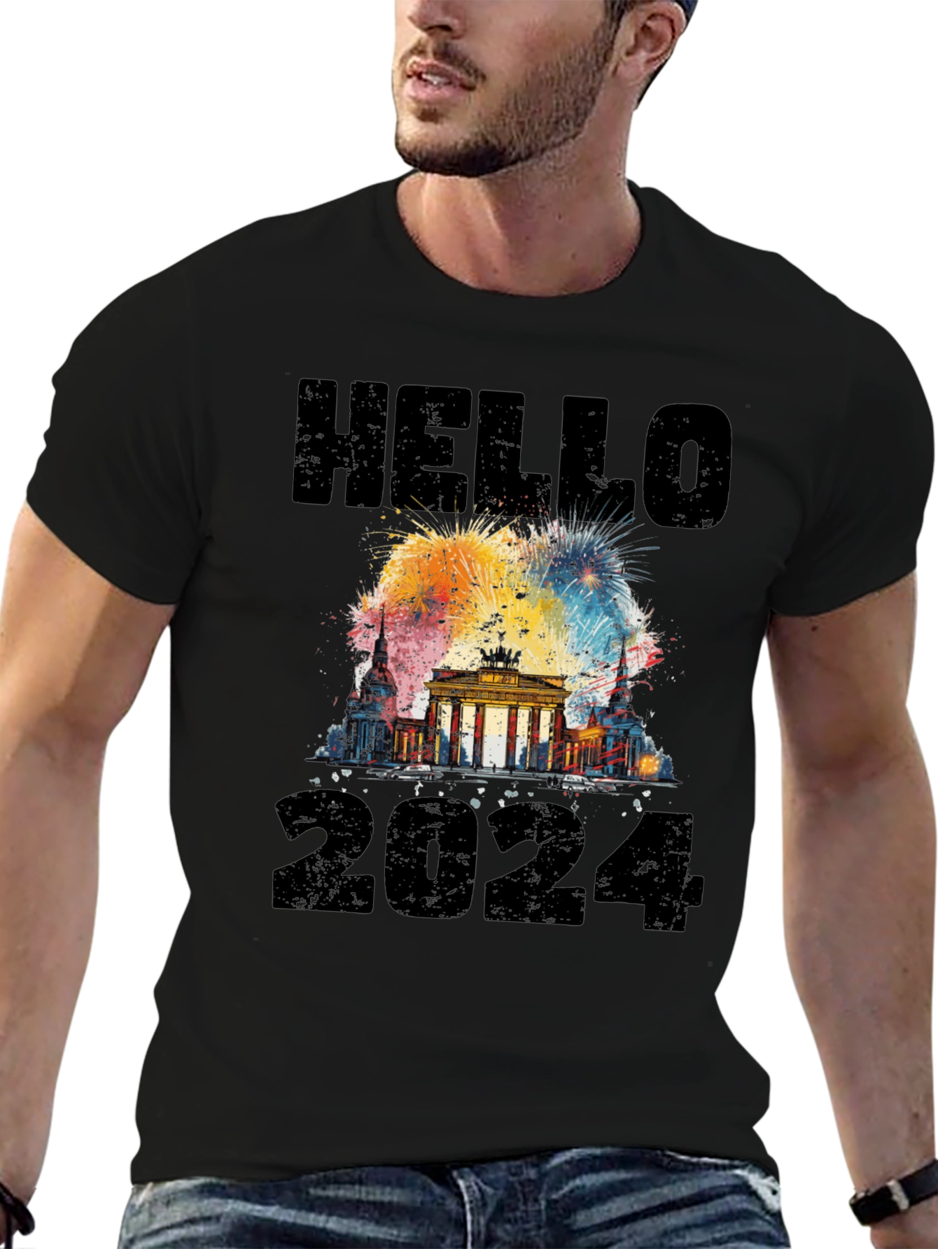 Celebrate the New Year in style with this unique black t-shirt! Featuring a vibrant graphic of the Brandenburg Gate with colorful fireworks exploding behind it, this shirt is the perfect way to ring in 2024. The design includes a bold "HELLO" above the landmark and "2024" below. Made from comfortable materials, this tee is perfect for New Year's Eve parties, vacations, or casual wear. Show off your love for Berlin and your excitement for the year to come with this eye-catching and festive shirt.