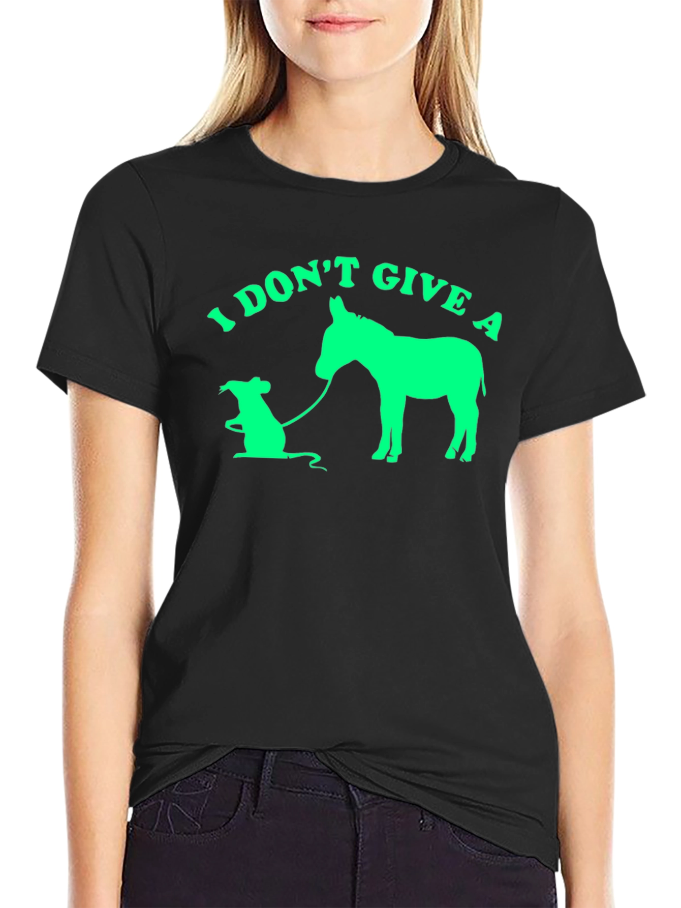 Show off your sense of humor with this unique and eye-catching t-shirt. This shirt features a green graphic on a black cotton tee that displays the phrase "I DON'T GIVE A" above an image of a rat leading a donkey by a leash. The design is fun, quirky, and guaranteed to spark conversation wherever you go. Made from a comfortable and durable cotton blend, this shirt is perfect for everyday wear. Pair it with jeans, shorts, or your favorite casual bottoms for a relaxed and stylish look. Makes a great gift for the pun-lover in your life!