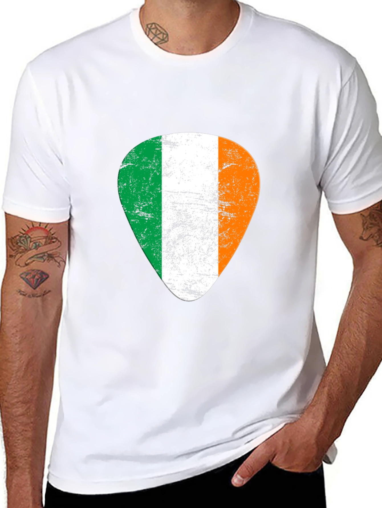 Show off your love for music and Irish pride with this unique t-shirt. The shirt features a distressed-style graphic of the Irish flag in the shape of a guitar pick. Made from a comfortable, breathable fabric, this black tee is perfect for casual wear. It's a great conversation starter for musicians and anyone with Irish heritage. The graphic design adds a touch of edgy style to your wardrobe. Ideal for St. Patrick's Day, concerts, or everyday wear to express your passion. Available in various sizes.