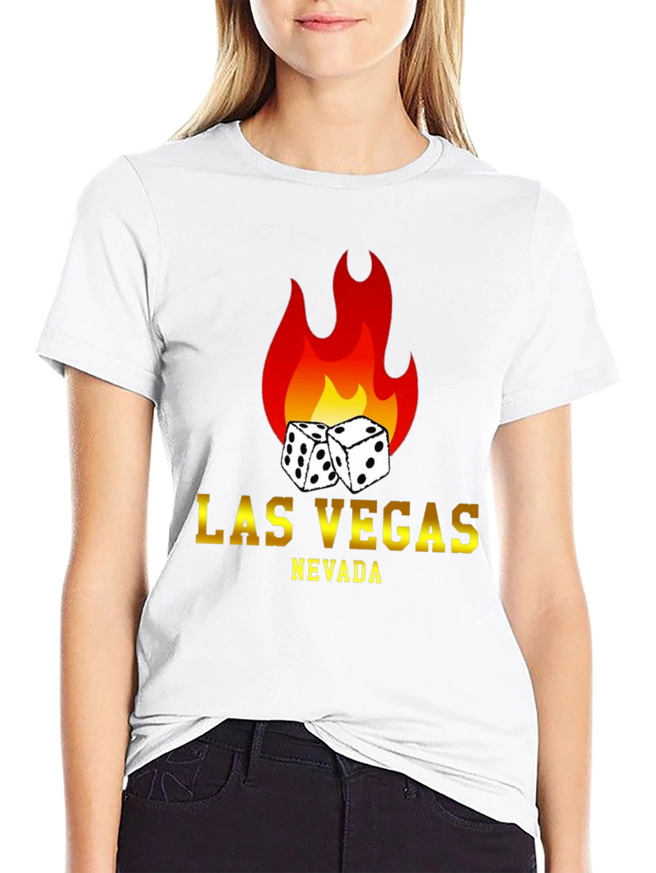 Show your love for Las Vegas with this unique black t-shirt. The shirt features a bold design with two dice set against a vibrant flame backdrop. Below, the words 'Las Vegas' and 'Nevada' are printed in a gold-like color, adding a touch of luxury. Made from a comfortable material, this t-shirt is perfect for casual wear, vacations, or as a souvenir from your trip to Vegas. Its eye-catching design makes it a great conversation starter and a must-have for anyone who loves the city of lights. This striking tee is sure to turn heads.