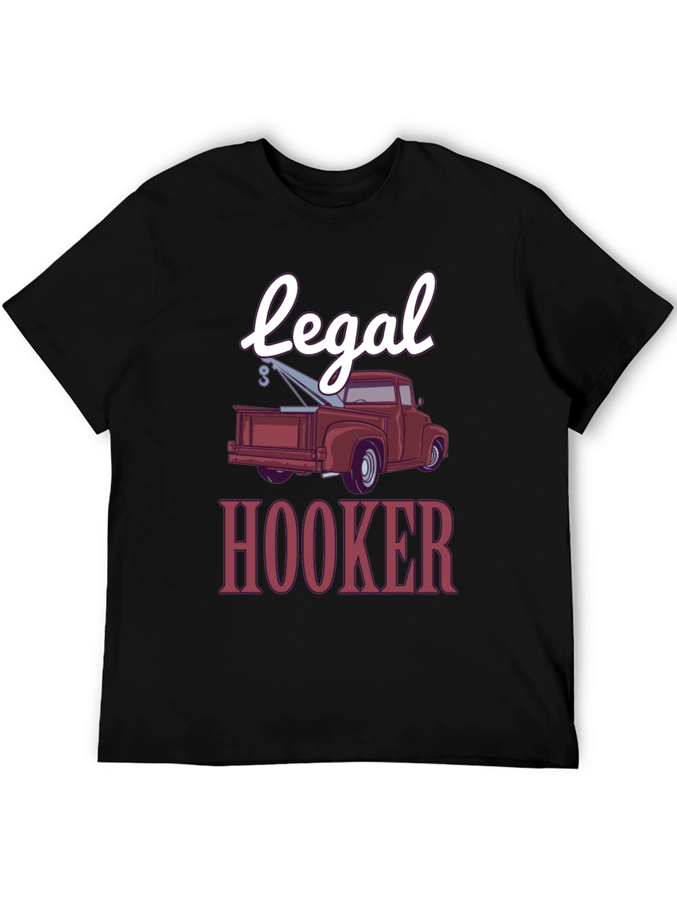 Show off your sense of humor with this funny "Legal Hooker" t-shirt! The black tee features a playful design with the word "legal" in white script above a vintage maroon tow truck graphic and the word "HOOKER" in maroon block letters. Made from soft, comfortable fabric, this shirt is perfect for casual wear, tow truck enthusiasts, or anyone with a quirky sense of style. This humorous shirt is sure to be a conversation starter wherever you go! Get yours today and add a touch of fun to your wardrobe.
