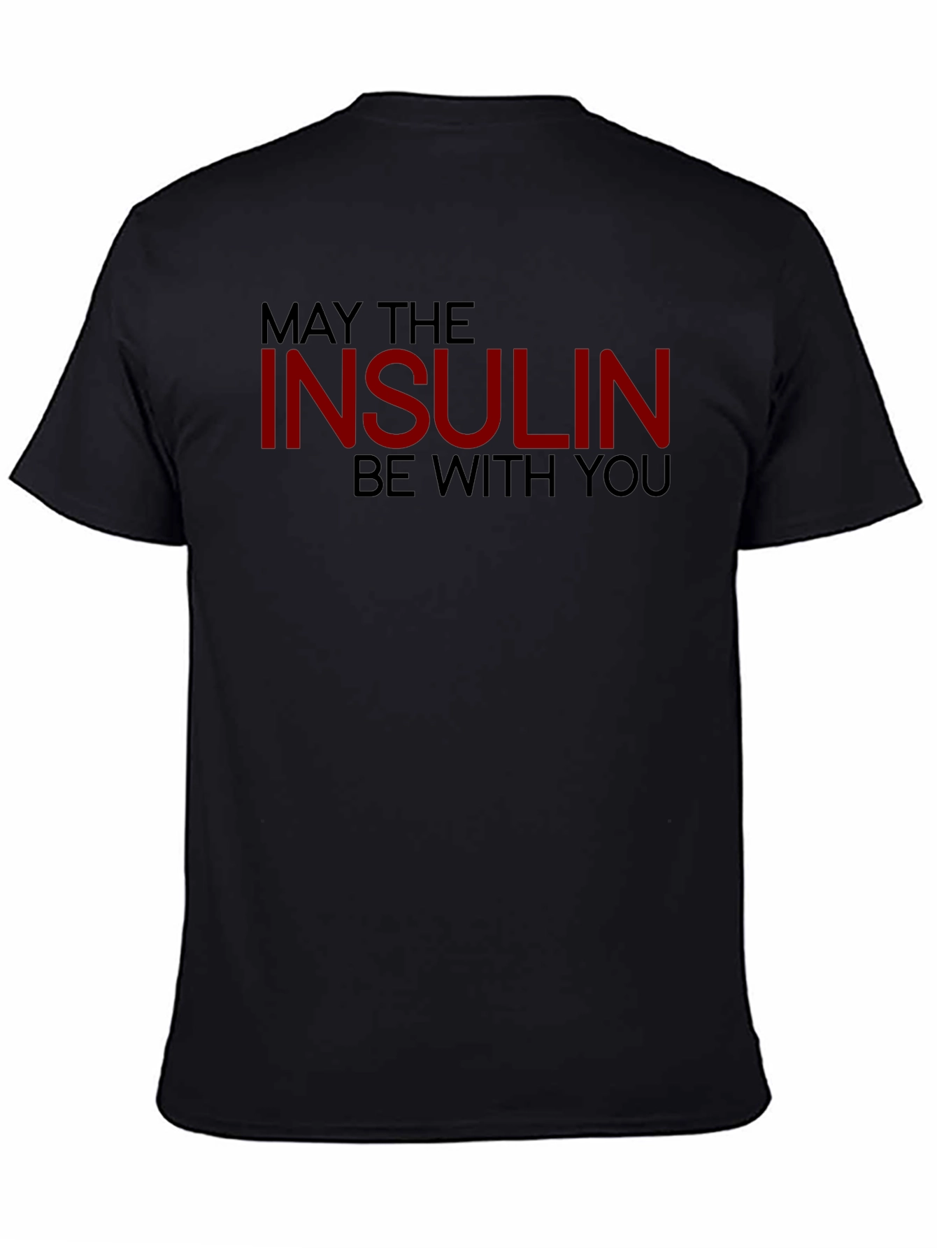 This black t-shirt features a humorous and attention-grabbing message: "May The Insulin Be With You". The word "INSULIN" is highlighted in red, adding a pop of color. This shirt is perfect for those who want to express their personality with a touch of wit. Made from what appears to be soft and comfortable fabric, this tee is ideal for casual wear, diabetes awareness events, or as a unique gift for someone with diabetes. The classic fit ensures it will look great on anyone. Show off your sense of humor and support diabetes awareness with this fun and memorable tee!