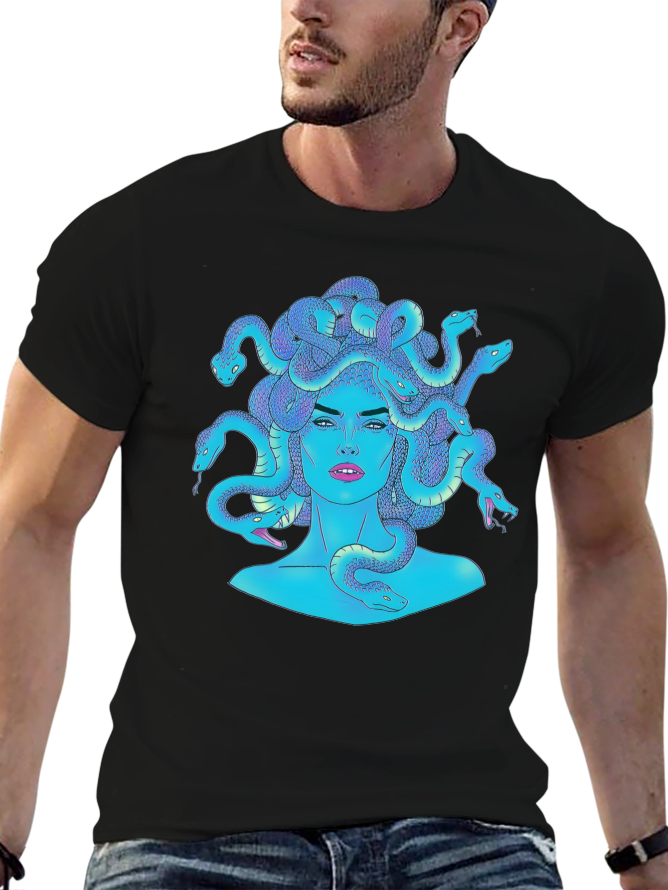 Embrace mythical style with this eye-catching black t-shirt featuring a vibrant Medusa graphic. The design showcases Medusa with her signature snake hair in striking blue tones and pink lips, creating a bold and artistic statement. Made from comfortable, breathable fabric, this tee is perfect for everyday wear or for adding an edgy touch to your outfit. Ideal for fans of Greek mythology or anyone who loves unique graphic designs. Stand out from the crowd and express your individual style with this captivating Medusa t-shirt.