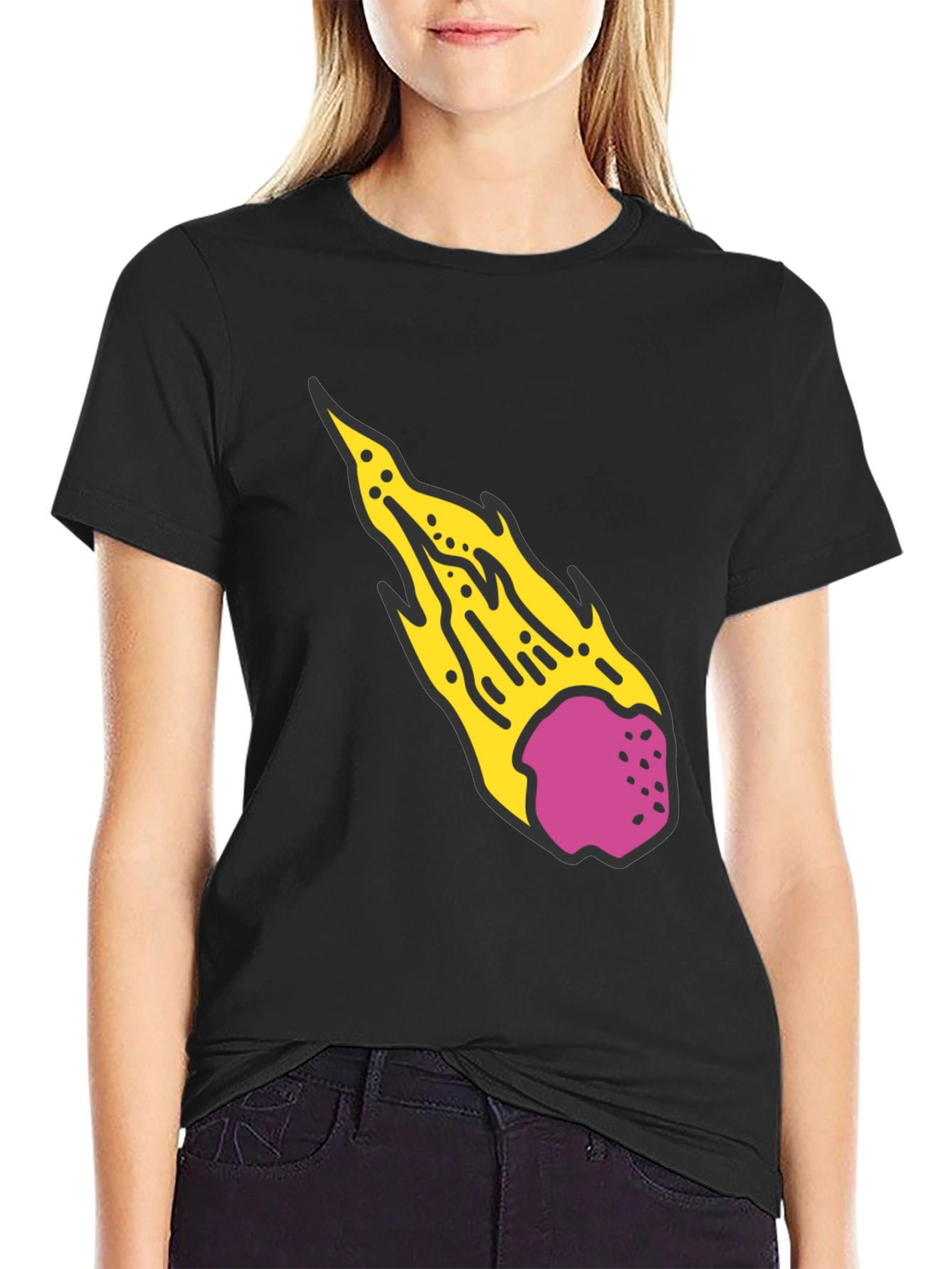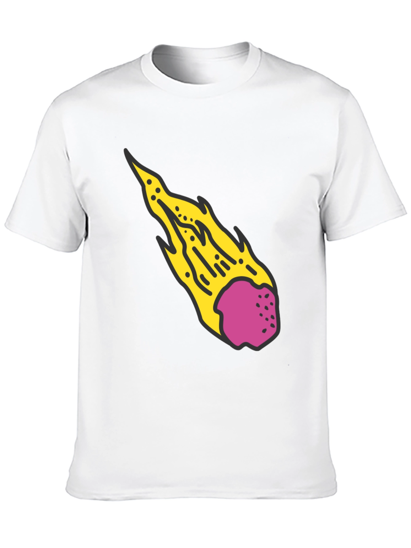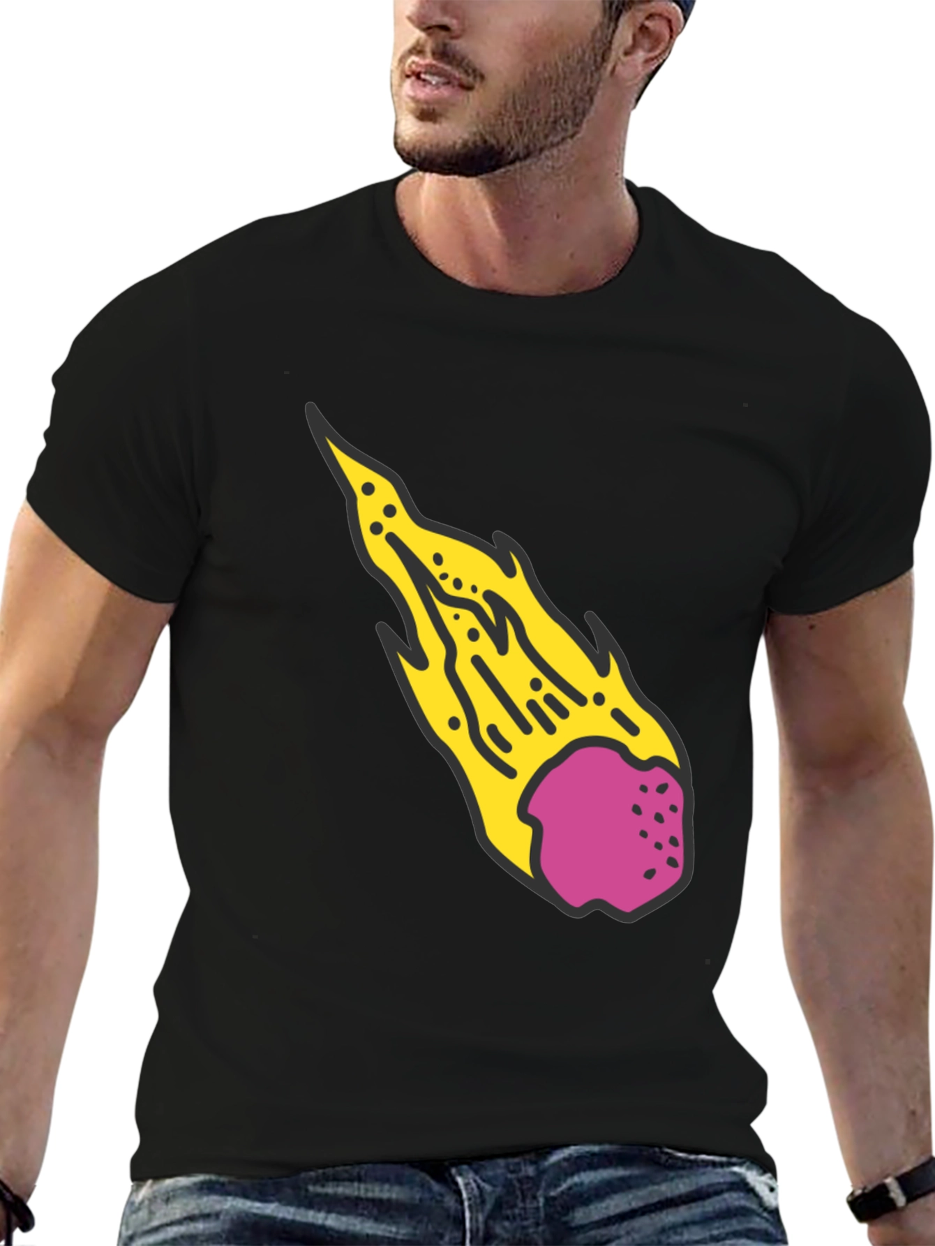 Stand out with this eye-catching black T-shirt featuring a unique meteor graphic. The design showcases a vibrant yellow flame and a contrasting pink head, making it a bold statement piece. Made from soft and breathable fabric, this tee offers all-day comfort and is perfect for casual wear. The classic fit is flattering for all body types. Wear it to concerts, parties, or just hanging out with friends. Add a touch of cosmic flair to your wardrobe with this must-have T-shirt.