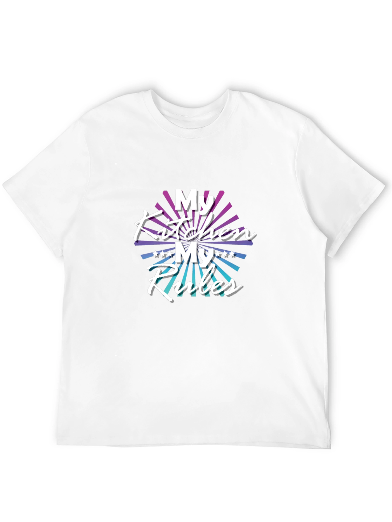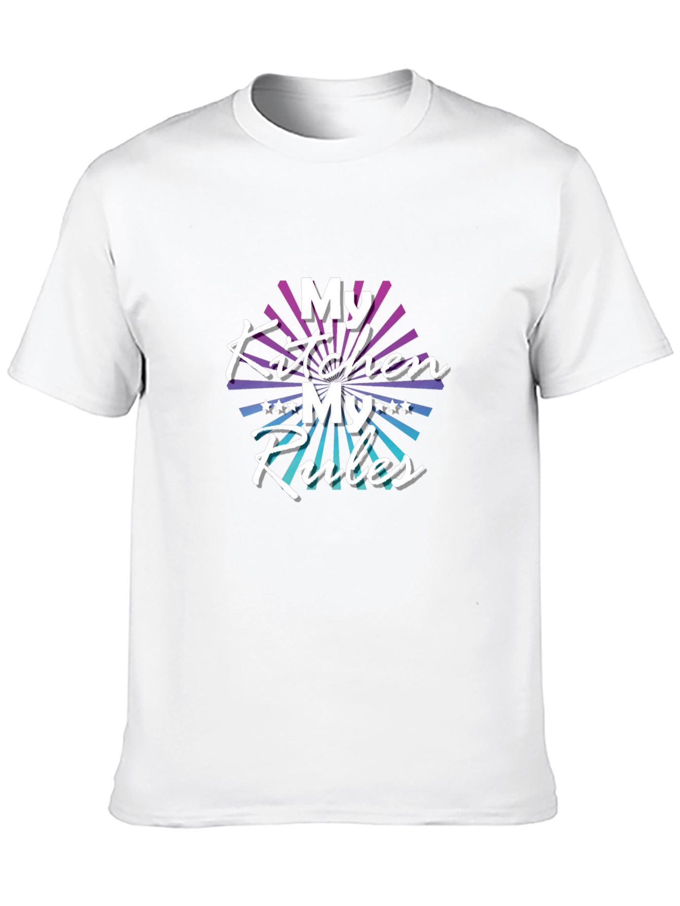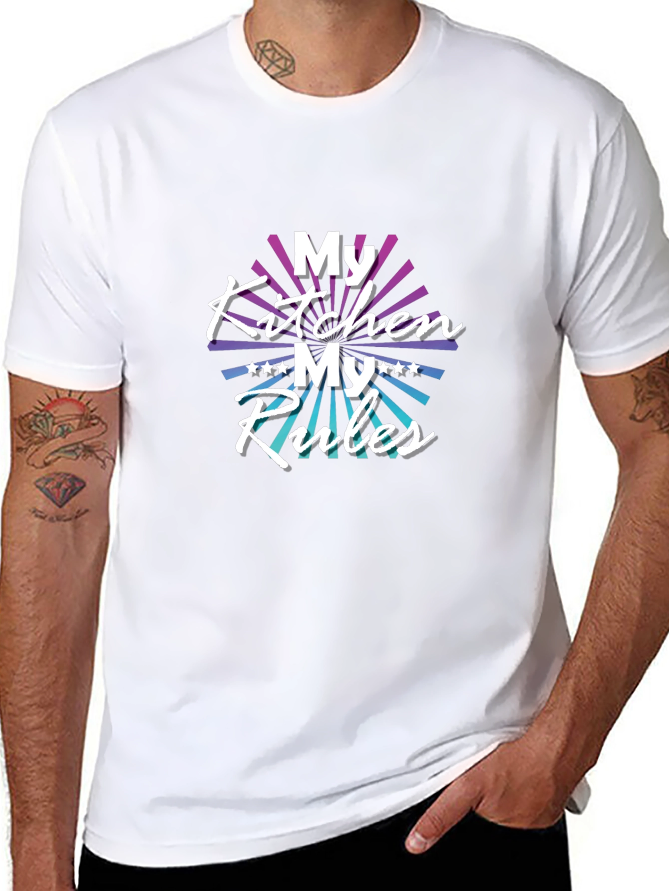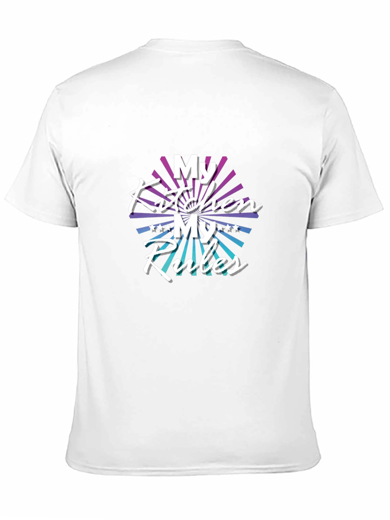 This stylish black t-shirt makes a statement in the kitchen. It features the playful phrase 'My Kitchen, My Rules' in a decorative white font, accented with purple and blue rays. This shirt is perfect for home chefs who want to show off their culinary pride and independent spirit. Made from a soft, comfortable fabric, this short-sleeved tee is ideal for cooking, baking, or simply relaxing at home. It combines comfort, style, and a touch of humor, making it a great gift for the passionate cook in your life.