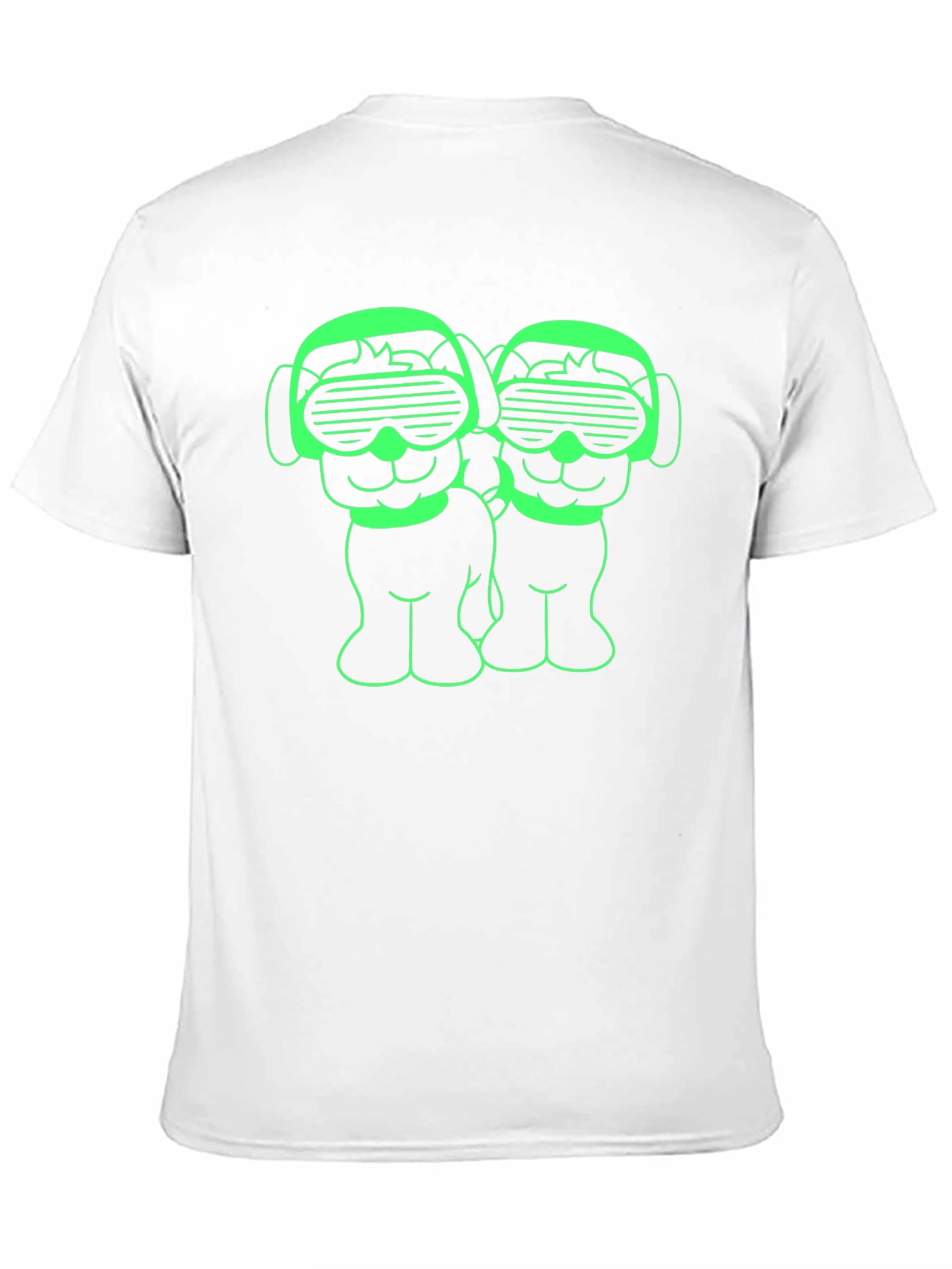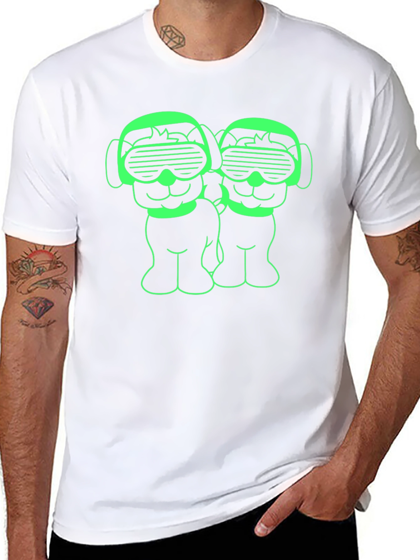 Show off your unique style with this eye-catching black t-shirt. This comfortable shirt features a playful neon green design of two dogs wearing futuristic glasses and headgear. Made from a soft cotton blend, this tee offers both style and comfort. The vibrant print is sure to turn heads, making it perfect for casual outings, parties, or just lounging around. Add a touch of fun to your wardrobe with this one-of-a-kind shirt. Great for dog lovers and anyone who appreciates a cool, modern design. Available in multiple sizes.