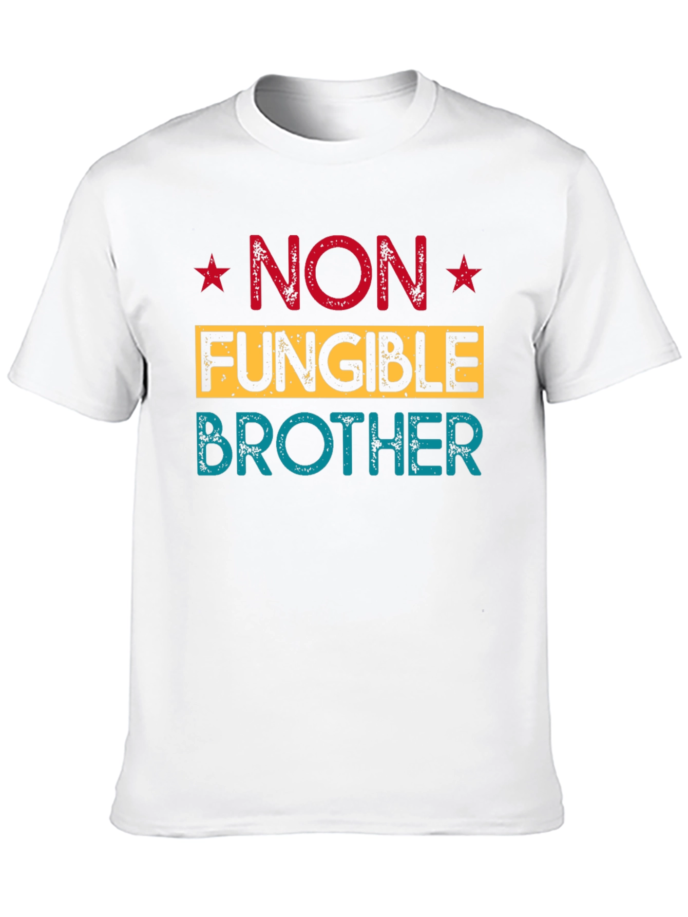 Show your support for your brother with this bold graphic t-shirt. The shirt features the phrase "Non Fungible Brother" in a striking design. The word "NON" is in red between two red stars, "FUNGIBLE" in yellow and "BROTHER" in aqua-blue. This eye-catching design will surely make a statement. Constructed from soft, breathable material, this tee is both comfortable and durable, perfect for everyday wear. Whether you're attending a casual hangout, running errands, or relaxing at home, this t-shirt is a great way to add some brotherly style to your wardrobe.