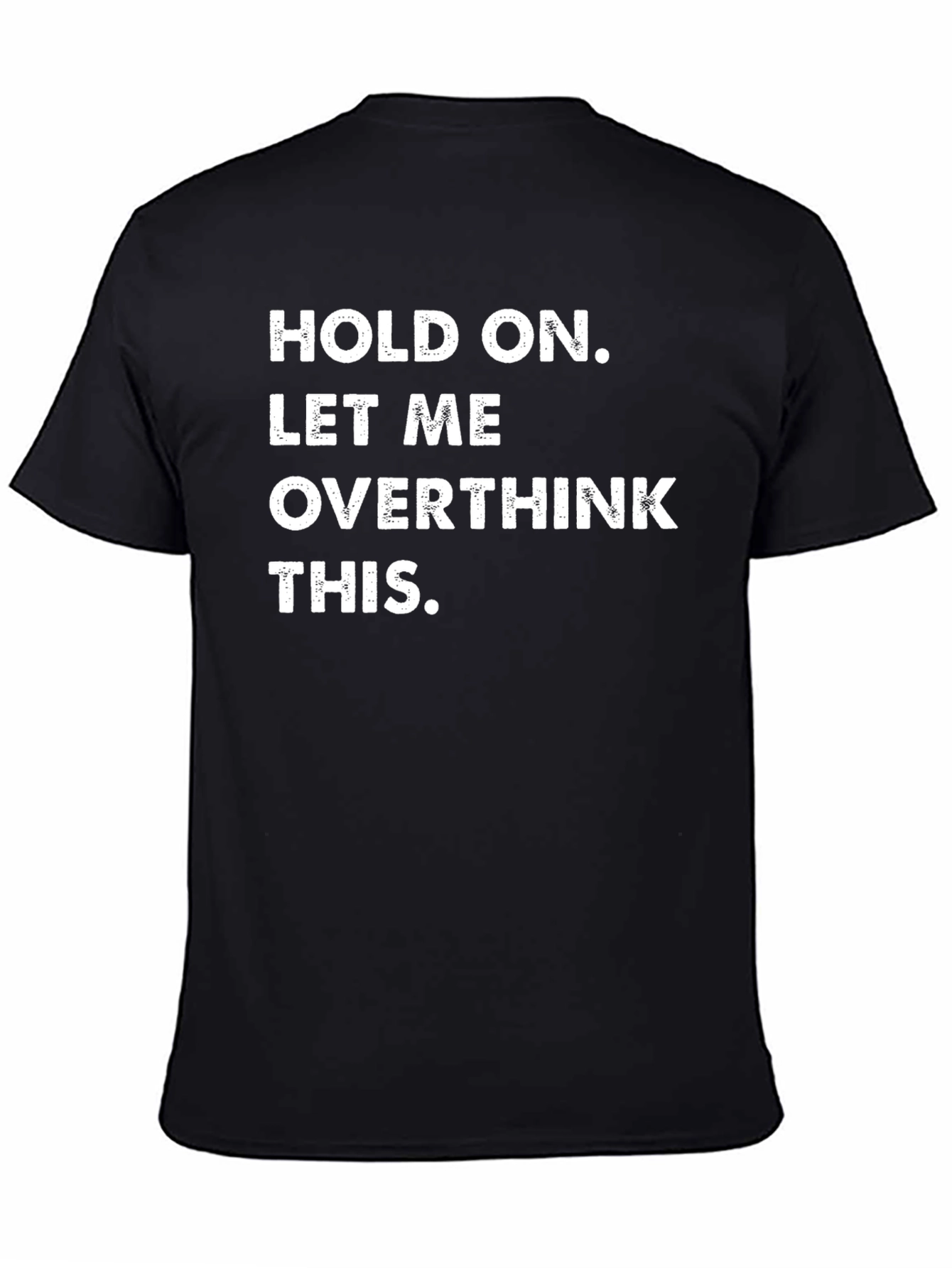 This black t-shirt features a bold, white graphic that reads "HOLD ON. LET ME OVERTHINK THIS." The classic crew neck and short sleeves make it a comfortable and versatile piece for everyday wear. The shirt's message adds a touch of humor and self-awareness to your style, making it a great conversation starter. Made from what appears to be a soft and breathable fabric, this tee is perfect for casual outings, lounging at home, or expressing your quirky personality. The simple yet eye-catching design ensures it pairs well with jeans, shorts, or even layered under a jacket. Embrace your overthinking tendencies with this fun and relatable tee!