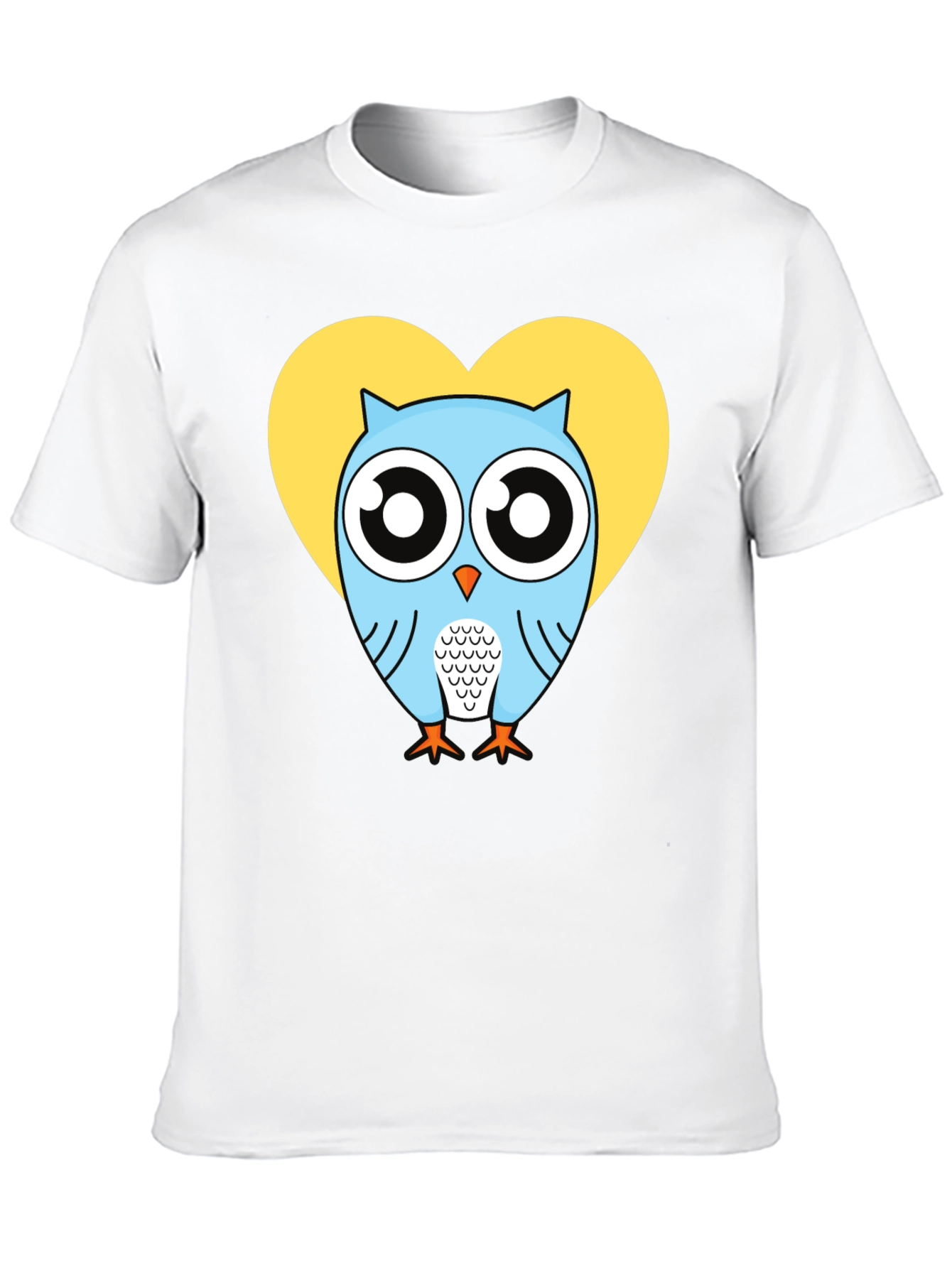 Show your love for owls with this trendy men's graphic t-shirt. This black tee features a playful blue cartoon owl set against a vibrant yellow heart backdrop. The whimsical design is perfect for casual wear, making it a fun addition to any wardrobe. Made from a comfortable fabric blend, this shirt offers both style and comfort for everyday use. Ideal for owl enthusiasts or anyone looking to add a touch of quirkiness to their outfit, this tee pairs well with jeans, shorts, or casual pants. Makes a great gift!