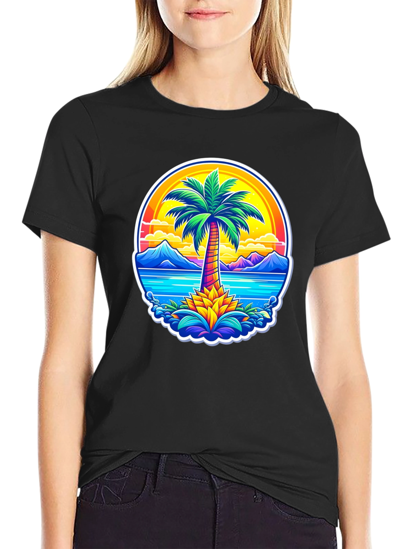 Embrace the island life with this vibrant graphic tee. Featuring a striking design of a palm tree rising from turquoise waters against a backdrop of distant mountains and a radiant sunset, this shirt captures the essence of a tropical paradise. The vivid colors and detailed illustration make it a standout piece in any wardrobe. Made from a comfortable, soft fabric, this tee is perfect for casual outings, beach trips, or simply adding a touch of vacation spirit to your everyday look. The classic fit ensures all-day comfort and easy styling. Show off your love for tropical destinations with this eye-catching and unique t-shirt.
