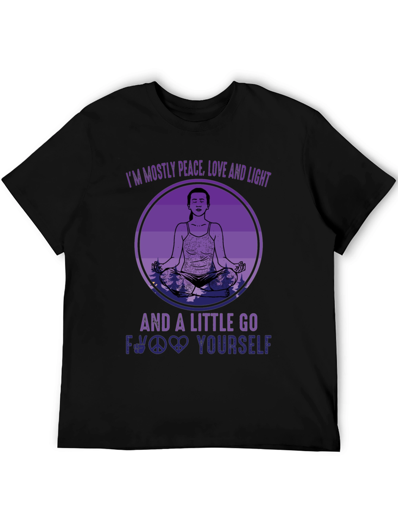 Embrace your inner zen with a touch of sass in this unique graphic tee. The shirt features an image of a woman meditating within a gradient purple circle, surrounded by stylized text. Above the circle, the shirt reads, "I'M MOSTLY PEACE, LOVE AND LIGHT." Below the circle, it says, "AND A LITTLE GO F**K YOURSELF," with a peace sign and heart as word replacements. The black t-shirt offers a comfortable fit and a bold statement. Ideal for yoga enthusiasts with a sense of humor or anyone who appreciates a blend of tranquility and attitude. Wear it to yoga class, casual outings, or simply to express your multifaceted personality.