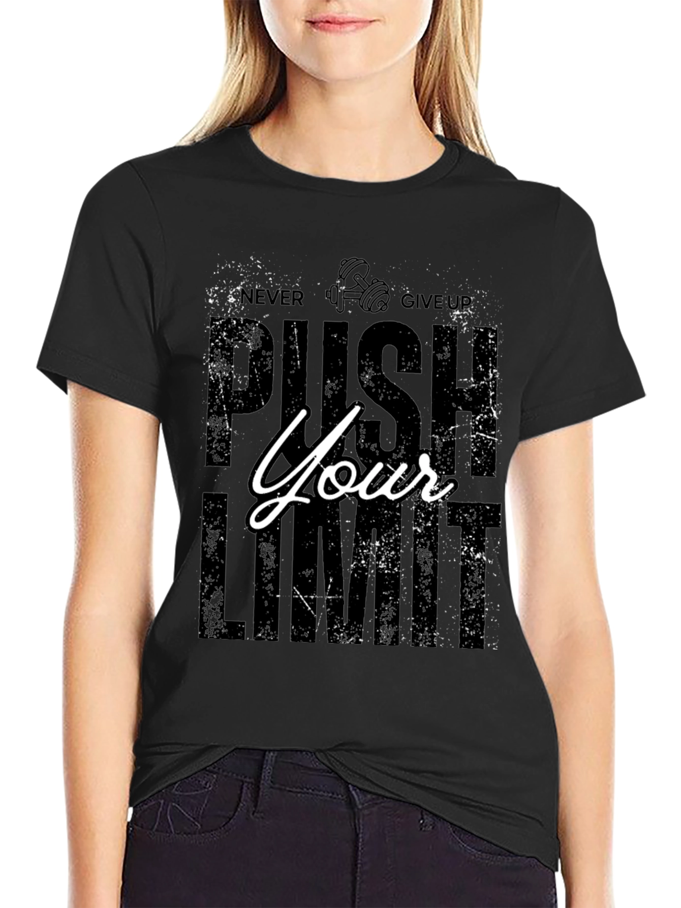 This black t-shirt features a bold graphic print with the motivational phrase "Push Your Limit." The design incorporates distressed elements for a vintage, edgy look. A minimalist dumbbell graphic is placed above the word 'PUSH'. The word 'Your' is in a stylish cursive font. Made from soft, breathable fabric, this tee offers both comfort and style. Perfect for workouts, casual outings, or everyday wear, it's a great way to showcase your dedication to fitness and self-improvement. Pair it with jeans, shorts, or athletic wear for a versatile and trendy look. Get inspired and push your boundaries with this statement tee!