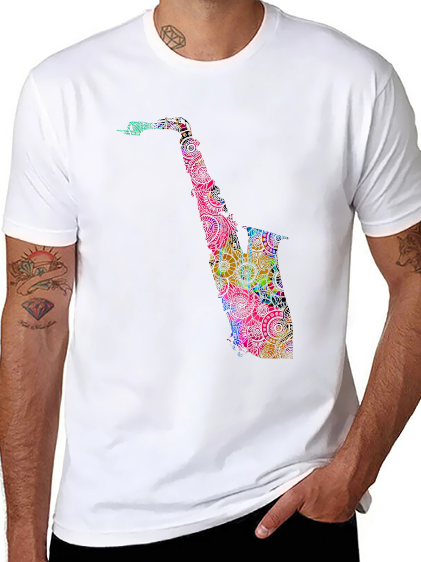 Express your love for music with this unique graphic tee! This black t-shirt features a vibrant, psychedelic saxophone design filled with intricate mandala patterns. The colorful design pops against the dark background. Made from soft, comfortable fabric, this tee is perfect for everyday wear, concerts, or music festivals. Stand out from the crowd and show off your passion with this eye-catching t-shirt. A great addition to any musician's wardrobe or a fun gift for music lovers.