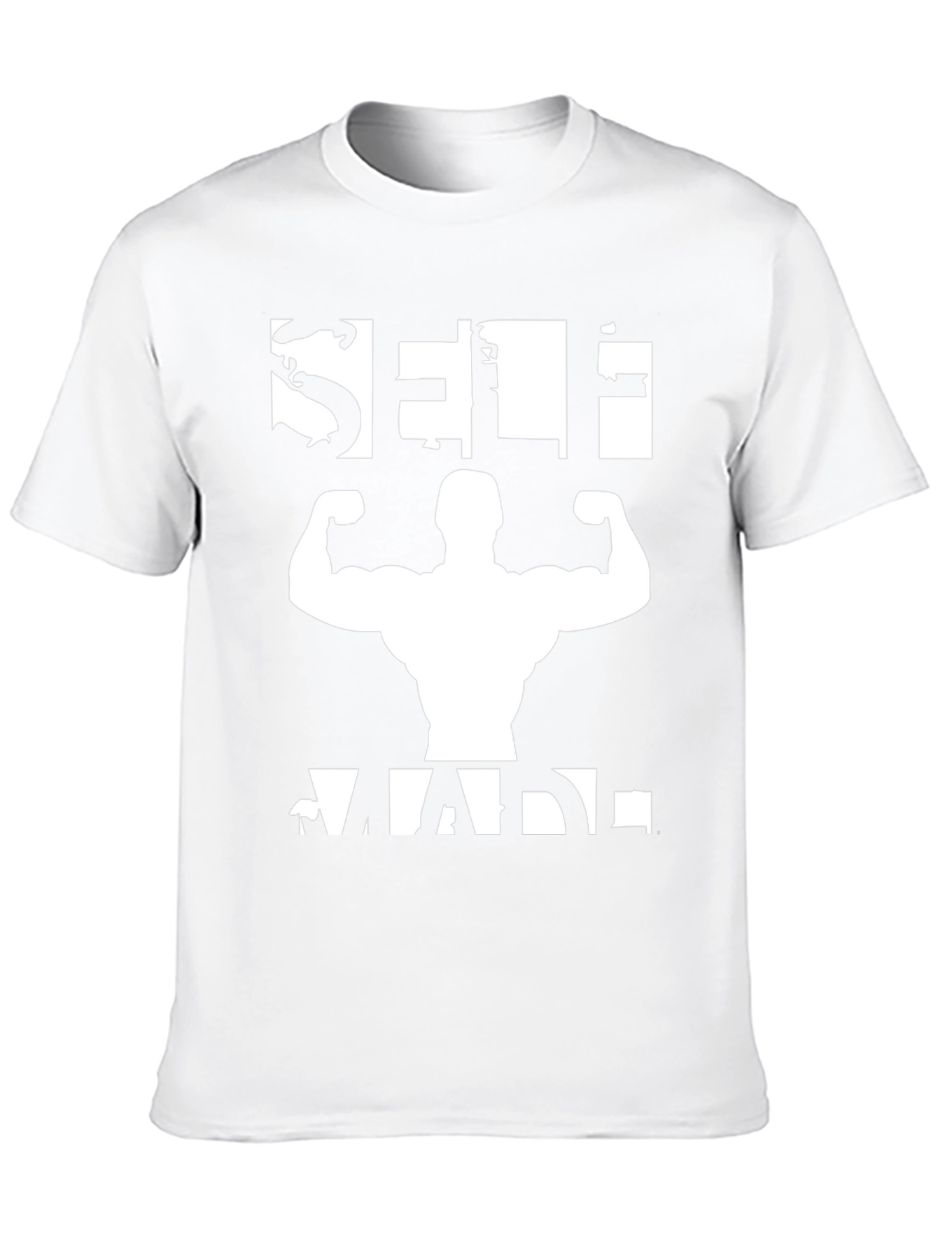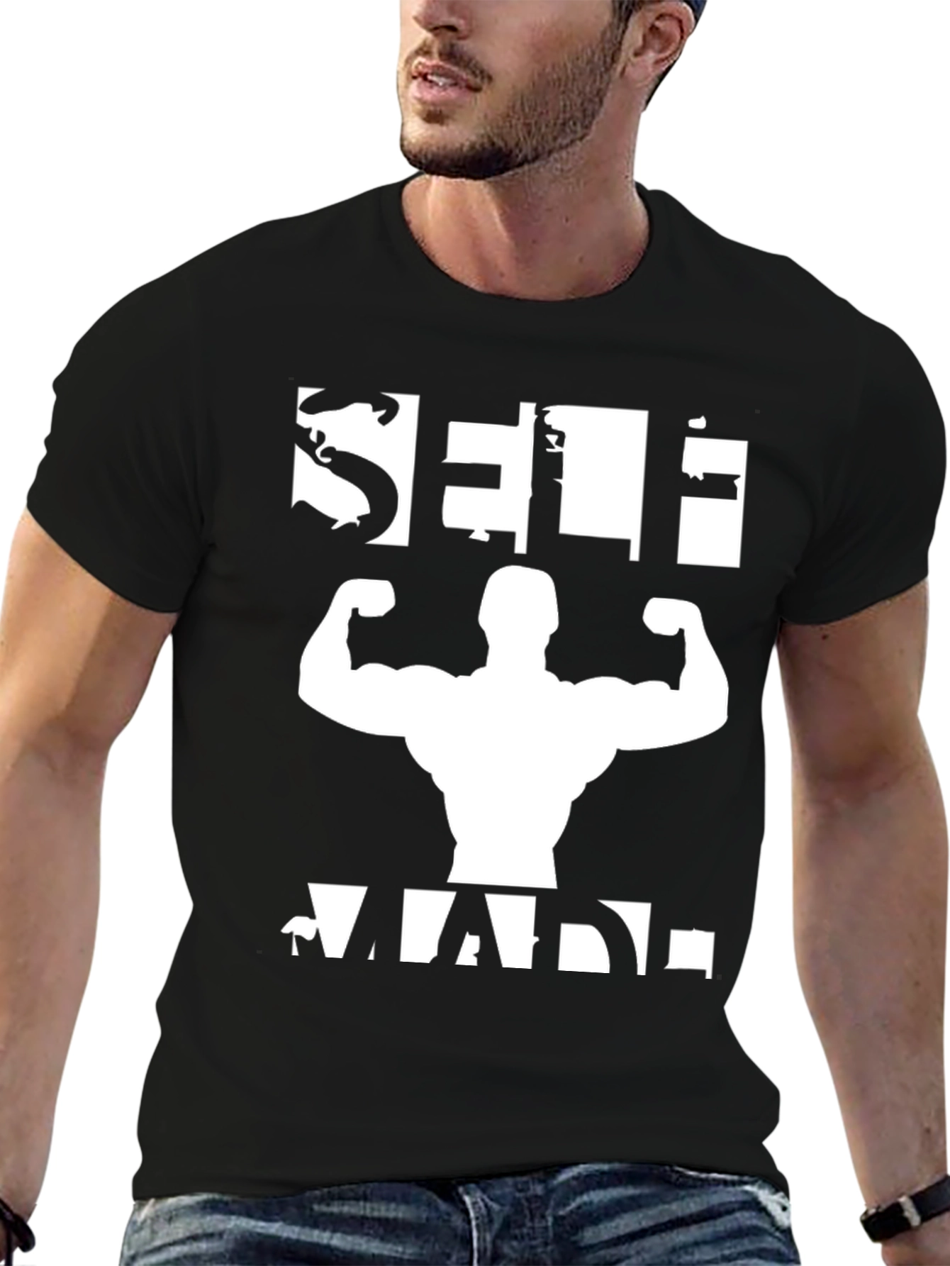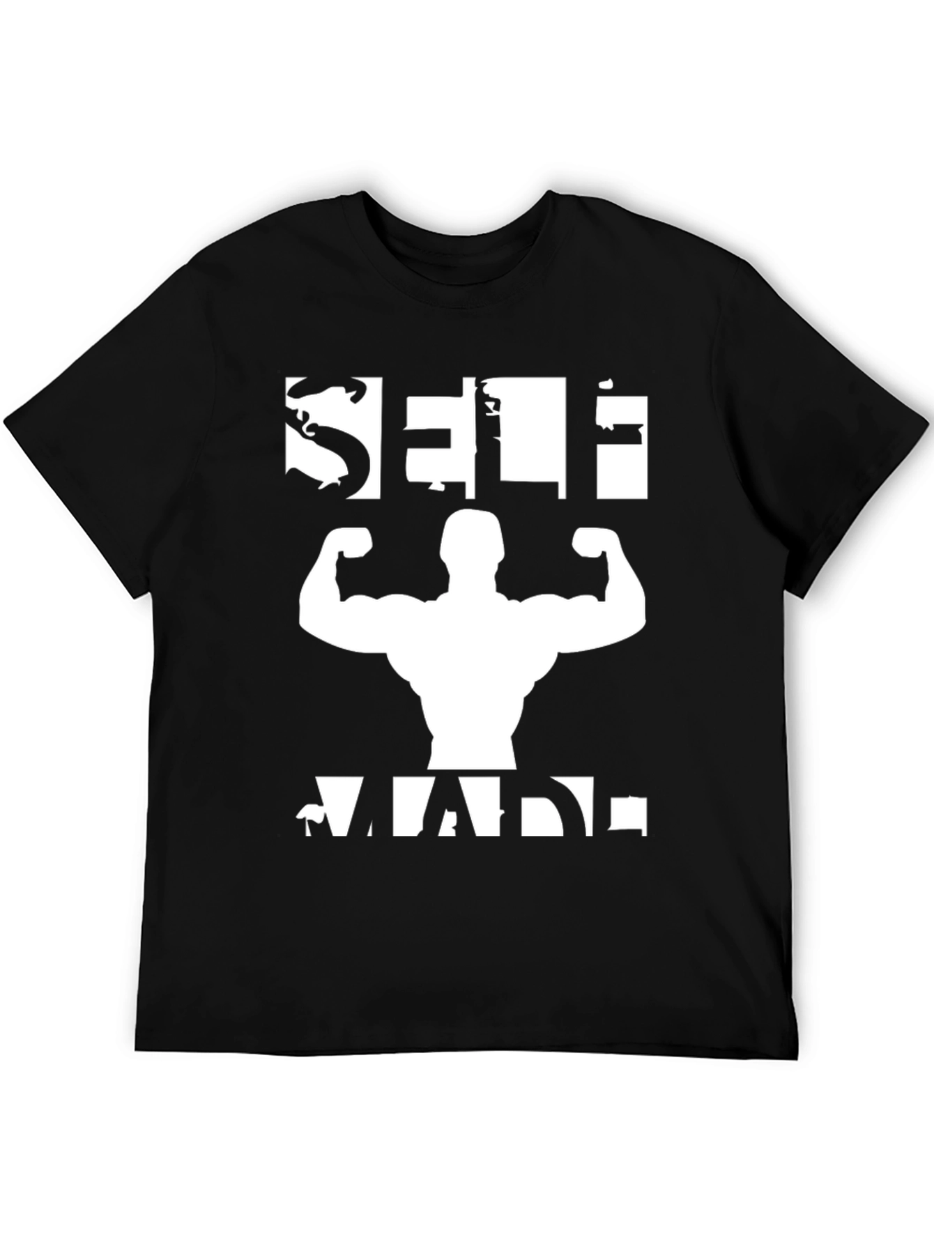 Show off your dedication and hard work with this 'Self Made' bodybuilding t-shirt. Featuring a bold white graphic on a classic black tee, this shirt makes a statement. The design incorporates a silhouette of a muscular physique, reinforcing the message of self-improvement and dedication. Made from comfortable materials, this tee is perfect for workouts at the gym or casual wear, expressing your passion for fitness and bodybuilding. Inspire yourself and others with this motivational tee.