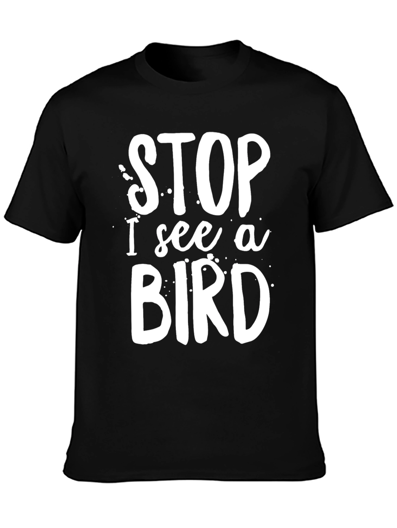 This striking black t-shirt features a bold, white graphic print that reads "STOP I see a BIRD". The design is playful and eye-catching, making it a great conversation starter. Perfect for bird watchers or anyone with a fun-loving personality. The shirt appears to be made from a soft and comfortable fabric, ensuring a great fit and feel. The casual style makes it versatile for everyday wear - dress it up with jeans and a jacket, or keep it casual with shorts. The eye-catching print adds a touch of humor and individuality to your wardrobe. Ideal for casual outings, bird watching adventures, or a gift for a bird lover.