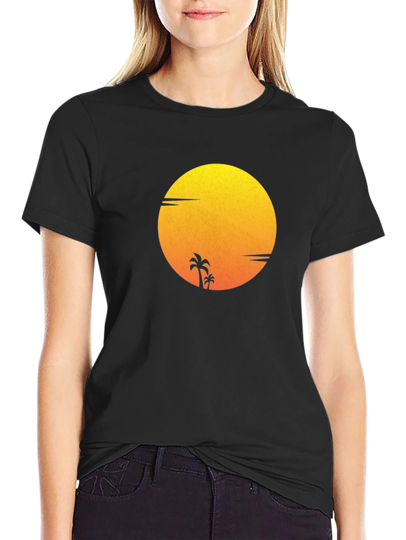 Embrace laid-back vibes with this stylish black t-shirt featuring a striking sunset graphic. The design showcases a warm-toned sun silhouette with palm trees, evoking a sense of tropical paradise. Made from what appears to be a soft, comfortable fabric, this tee is perfect for everyday wear. Its classic fit makes it versatile for various casual occasions, from beach outings to weekend hangouts. Pair it with jeans, shorts, or chinos for an effortlessly cool look. Add a touch of vacation feeling to your wardrobe with this eye-catching graphic tee.