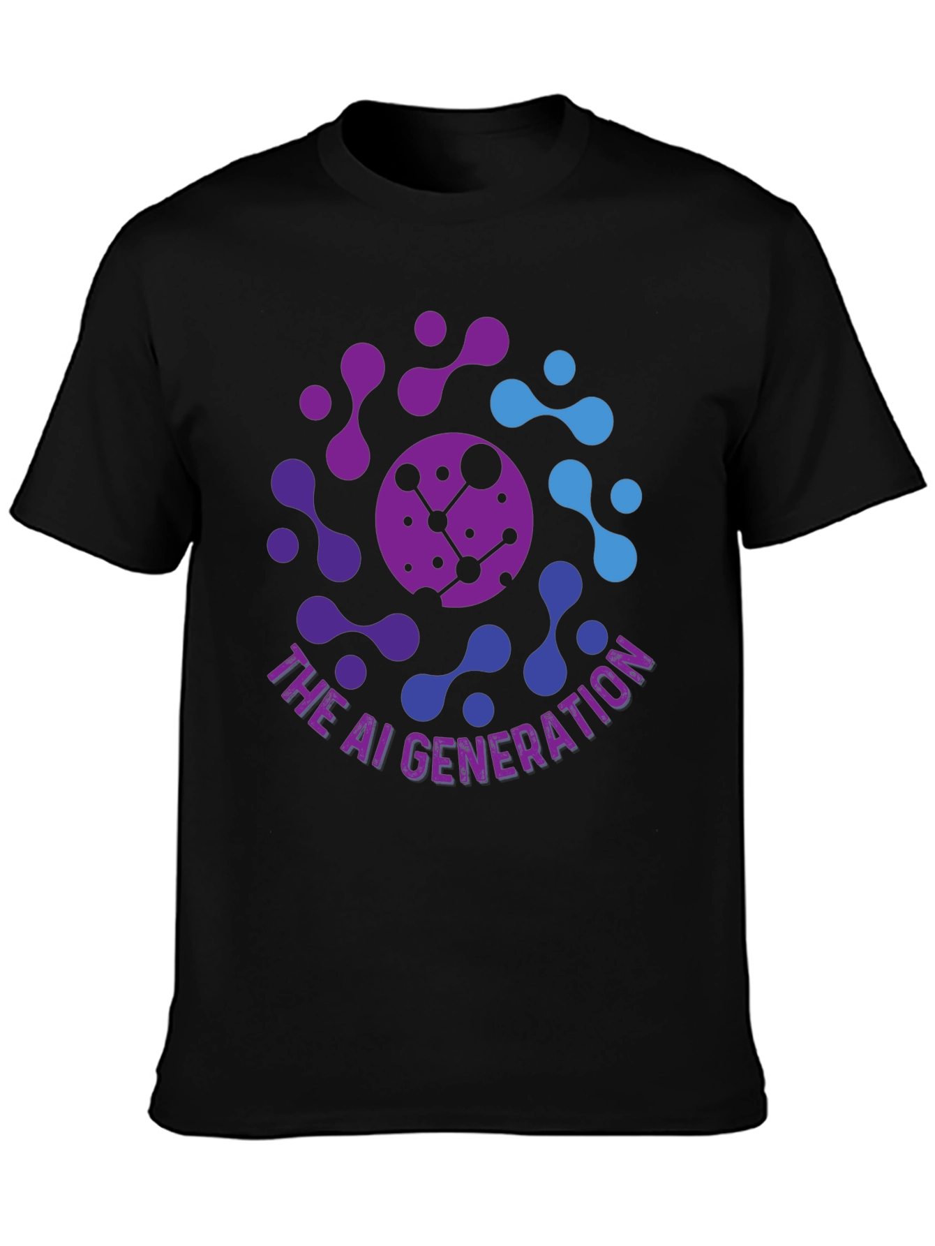 Show off your love for technology with this striking black T-shirt. It features a vibrant, modern design showcasing a central circle with interconnected nodes, surrounded by a dynamic array of molecular-like shapes in shades of purple and blue. The text "THE AI GENERATION" elegantly curves around the design, making it a perfect conversation starter for tech enthusiasts. Made from comfortable, breathable fabric, this tee is ideal for casual wear, tech conferences, or just expressing your interest in artificial intelligence. A stylish and unique addition to any wardrobe.