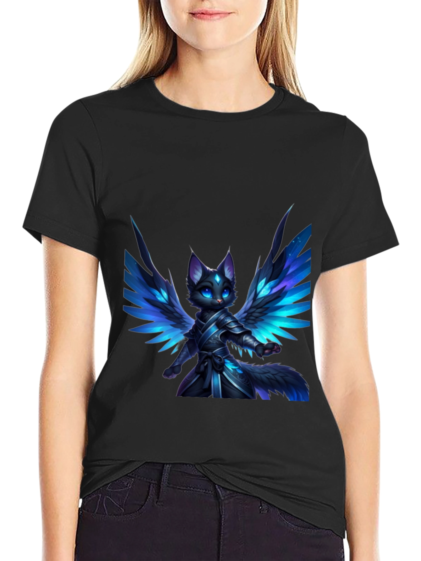 Unleash your inner warrior with this striking black t-shirt featuring a captivating graphic of a winged feline warrior. The detailed design showcases a black cat with vibrant blue and purple wings, clad in stylized armor. The vivid colors and intricate details of the artwork make this tee a standout piece. Made from comfortable materials, this shirt is perfect for everyday wear, casual outings, or as a unique addition to any wardrobe. Show off your love for fantasy and felines with this eye-catching tee!